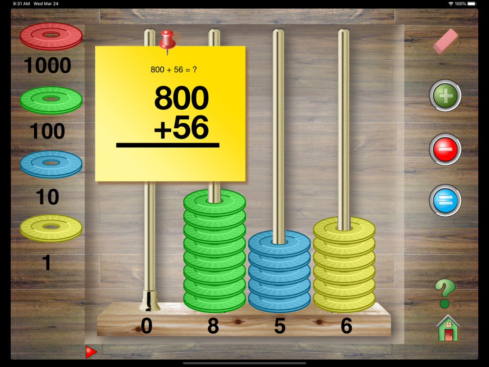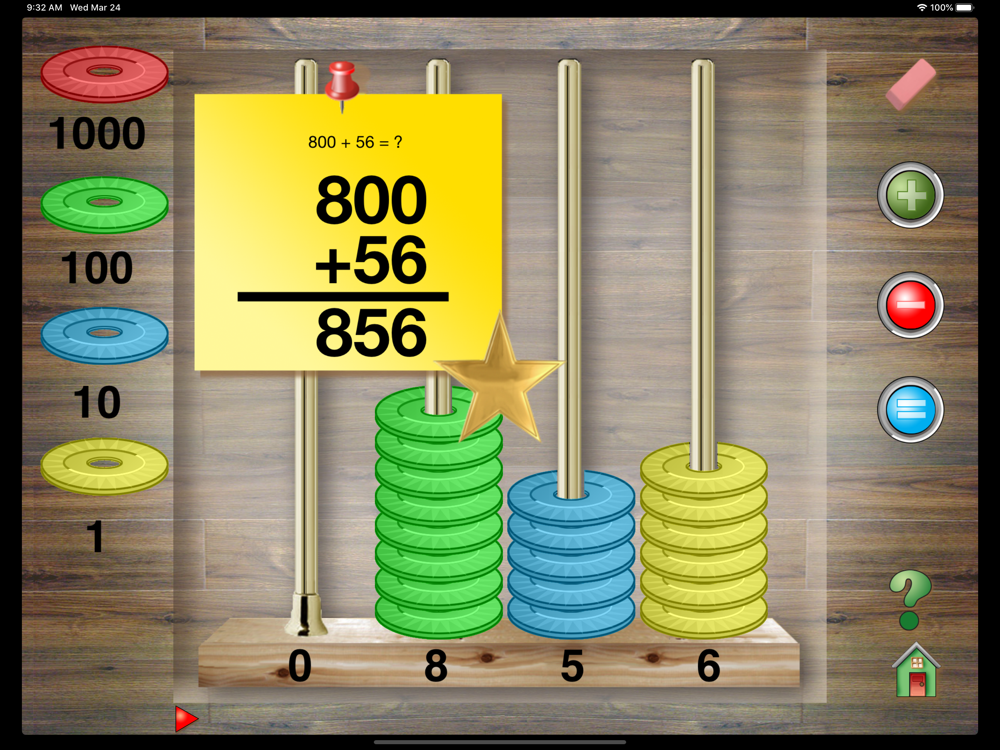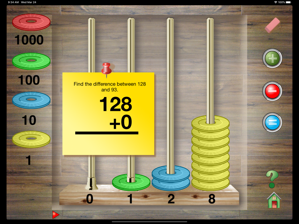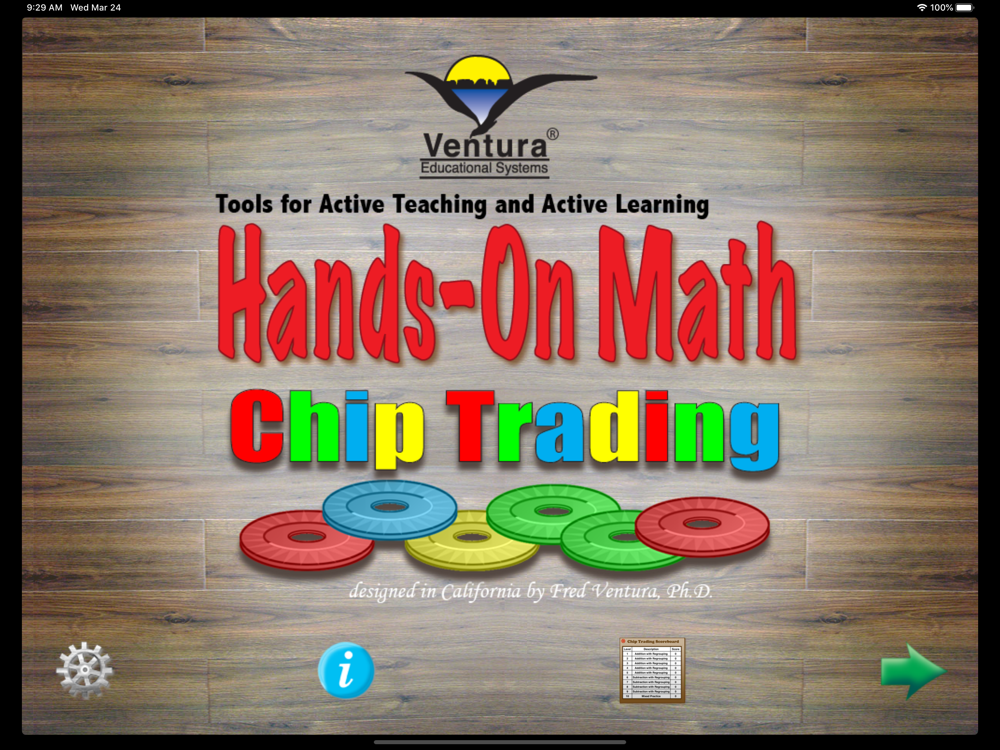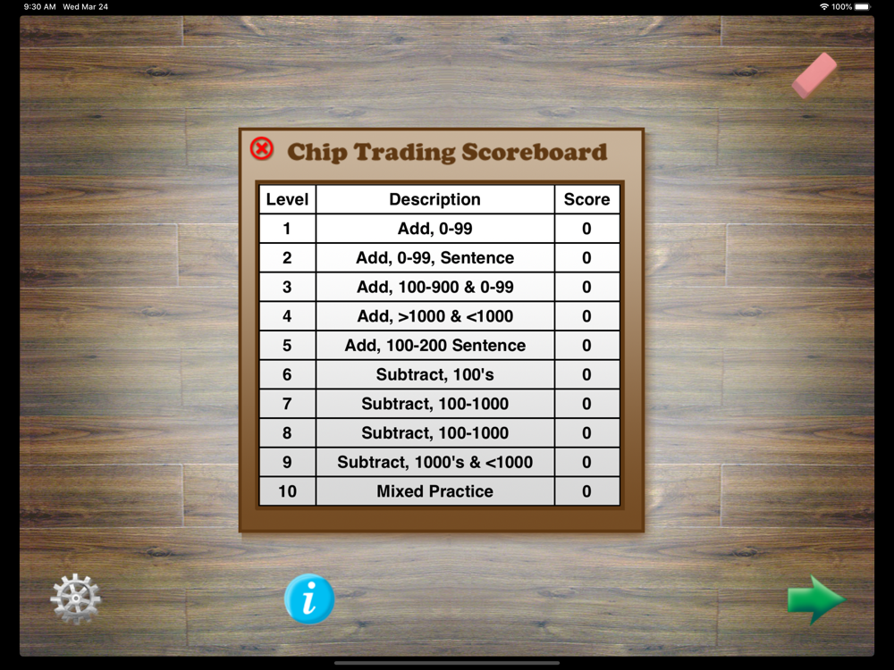 By tapping an icon a randomly generated problem appears on the screen. Using Hands-On Math Chip Trading students enter the answer to the problem by moving chips in to columns. If an error occurs, specific feedback about the error is given. Progress toward learning objectives is tracked on the scoreboard.