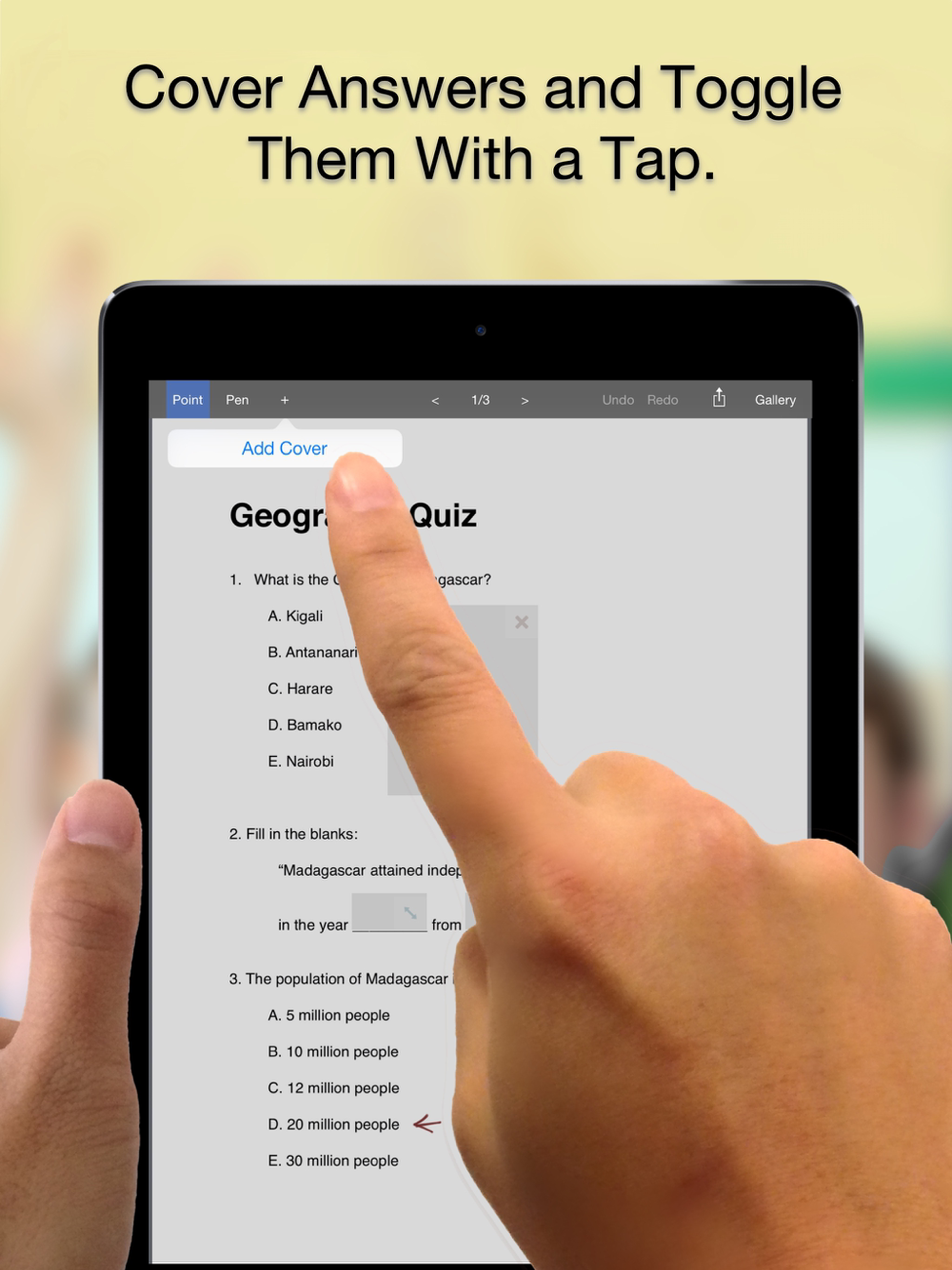 Add covers over answers to questions, and tap to toggle them. Great for in-class quizzes or to enhance class participation.