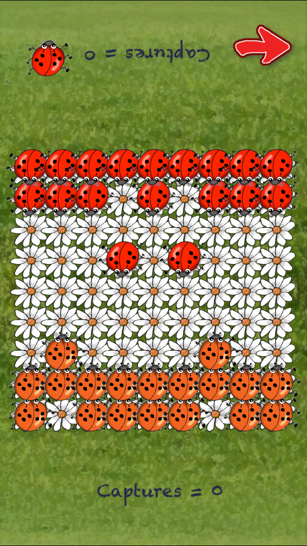 MOVES and JUMPS: During a turn a player can move one or more spaces in any of four directions: forward, backward, left or right. A beetle jump over any adjacent beetle. To make a move touch a beetle and then touch the destination. Capture your opponents beetles by making a 'beetle sandwich'.
