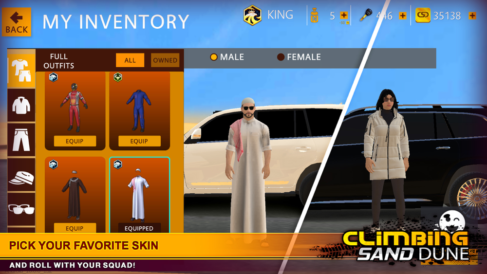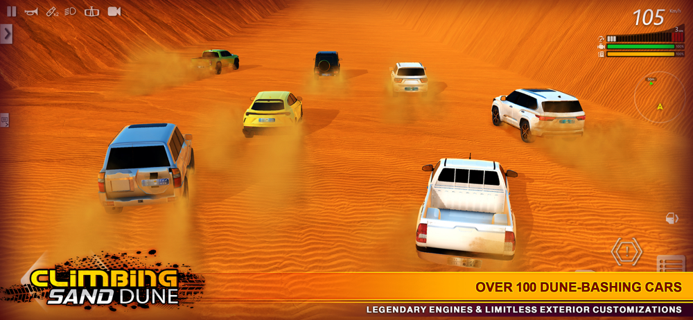 Game Mode - Drag Race is the most popular game mode, very challenging to win the race and there is a daily championship with generous gifts. Free Roaming in a desert gives you the freedom of climbing dunes, hooking some treasure boxes or hooking a friend out of sand or flood. Flag challenge has the most fun gameplay but only opens on special occasions. Climbing races are made for fearless climbers. Can You Dare to Challenge?