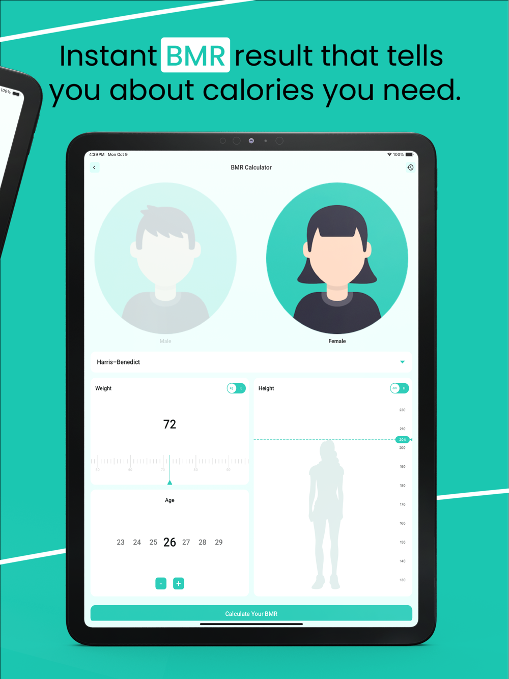 • BMR calculation is based on Mifflin and St Jeor as well as the Harris-Benedict equation.