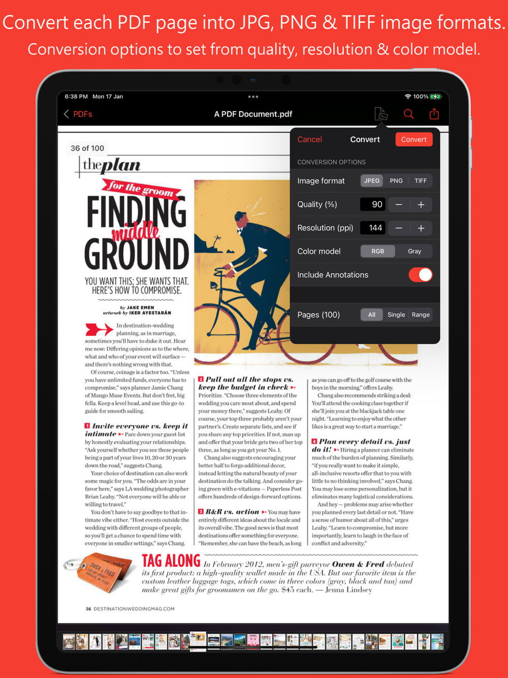PDF to JPG is an intuitive app to convert PDF documents into best quality JPG, PNG and TIFF images on iPhones and iPads. PDF to JPG converts each PDF page as image and make it available for any application for reuse.