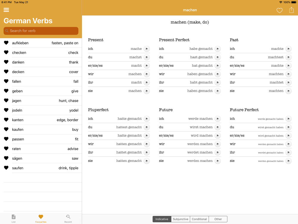 View over 1500 German verbs in 16 tenses. With simple navigation and built in search, you can find the verb you need in seconds.