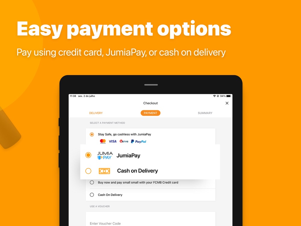 Payment made easy with secure payment options such as cash on delivery, mobile money or pay using your credit card with our secure payment system Jumia Pay.