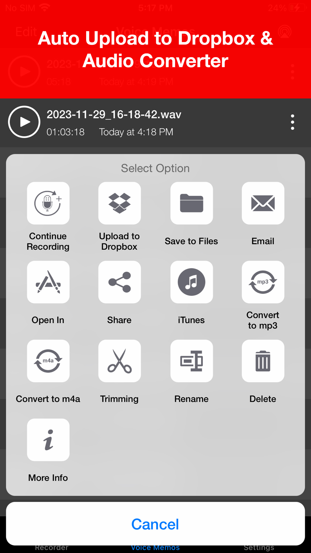 - Format options: (WAV, CAF, M4A)