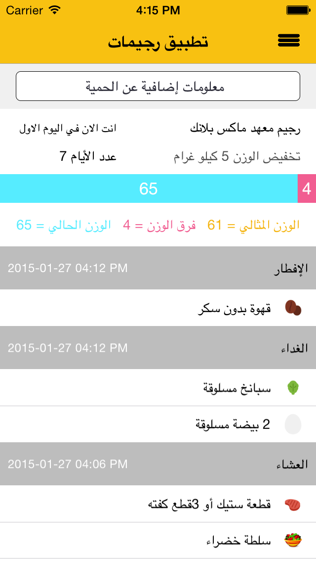 عبارة عن تطبيق سهل الاستخدام يقدم نصائح و إرشادات تسهل على الشخص متابعة و زنه و الوصول الى الوزن المثالي عبر وضع عدد كبير من أنواع الروجيم بين يديه فيختار من خلالها الرجيم المناسب و اللذي بدوره يوفر له المعلومات الكافية عن مكونات و كميات الطعام و السعرات الحرارية اللازم تناولها خلال الوجبات اليومية الثلاثة على مدار الاسبوع مع الاخذ بالحسبان الانشطة الرياضية التي قد يمارسها الشخص أثناء التزامه بالحمية