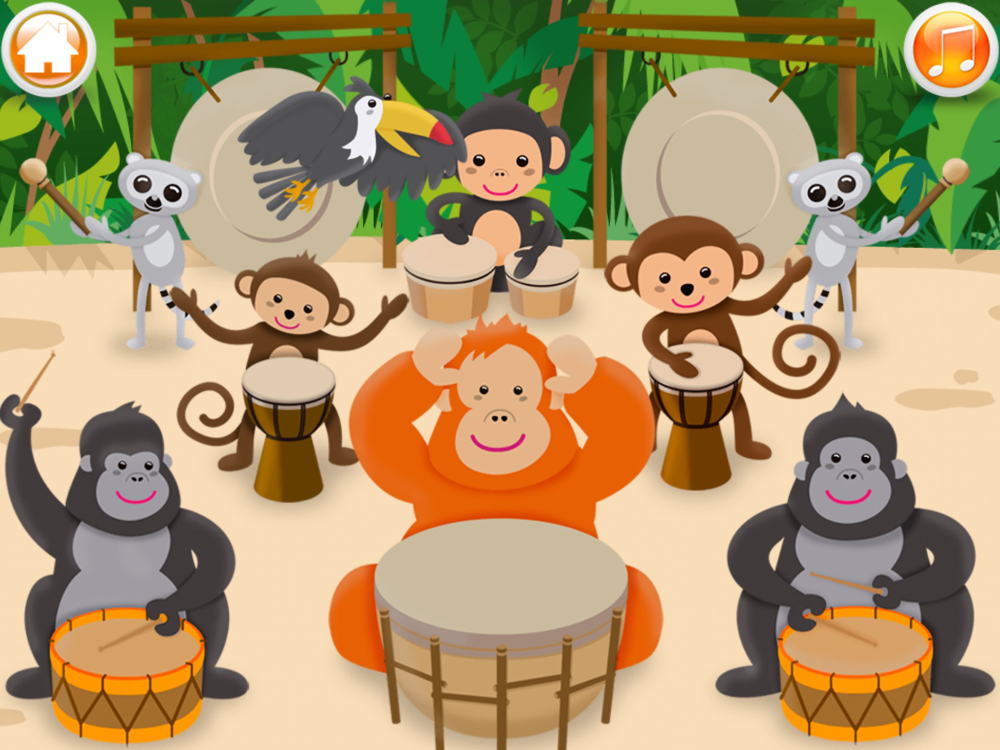 Play the piano, xylophone and drums in different animated scenes.