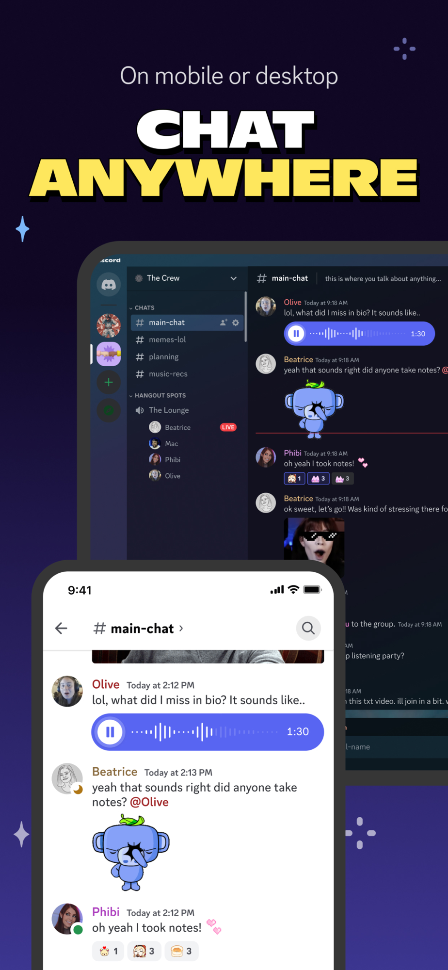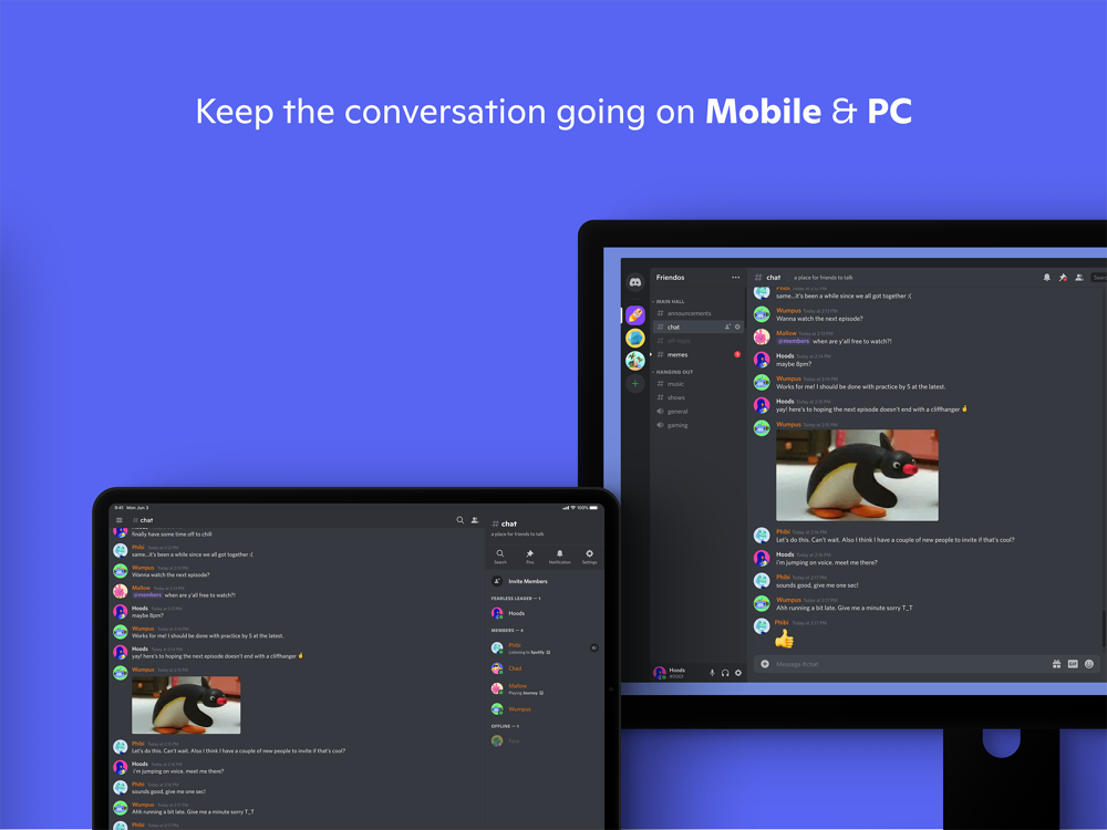 Discord is where you can make a home for your communities and friends. Where you can stay close and have fun over text, voice, and video chat. Whether you’re part of a school club, a gaming group, a worldwide art community, or just a handful of friends who want to spend time together, Discord makes it easy to talk every day, and hang out more often.
