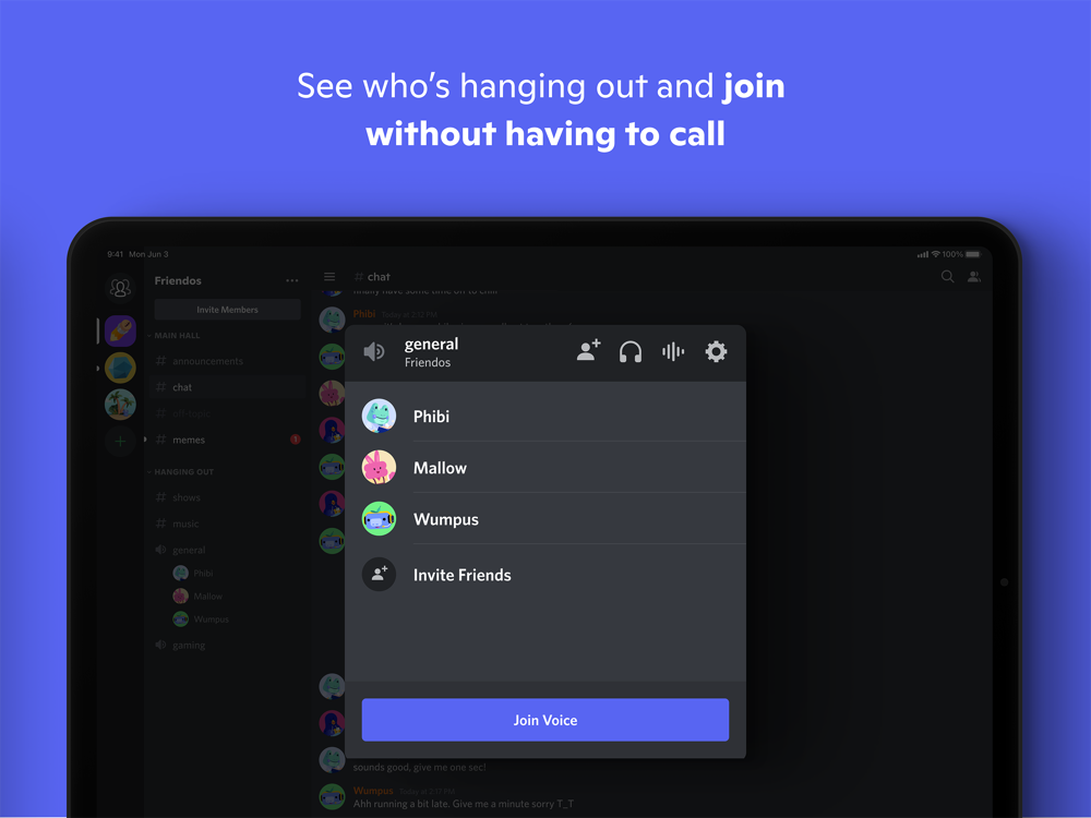 • Voice channels make hanging out easy. Got a free moment? Grab a seat in a voice channel so friends can see you’re around and pop in to talk without having to call. You can even watch videos together!