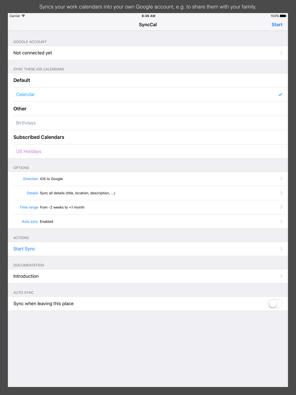 This is a lite version of SyncCal. If you like it you can buy the full version, which can also sync automatically in the background when you leave a configured location or at a regular interval.