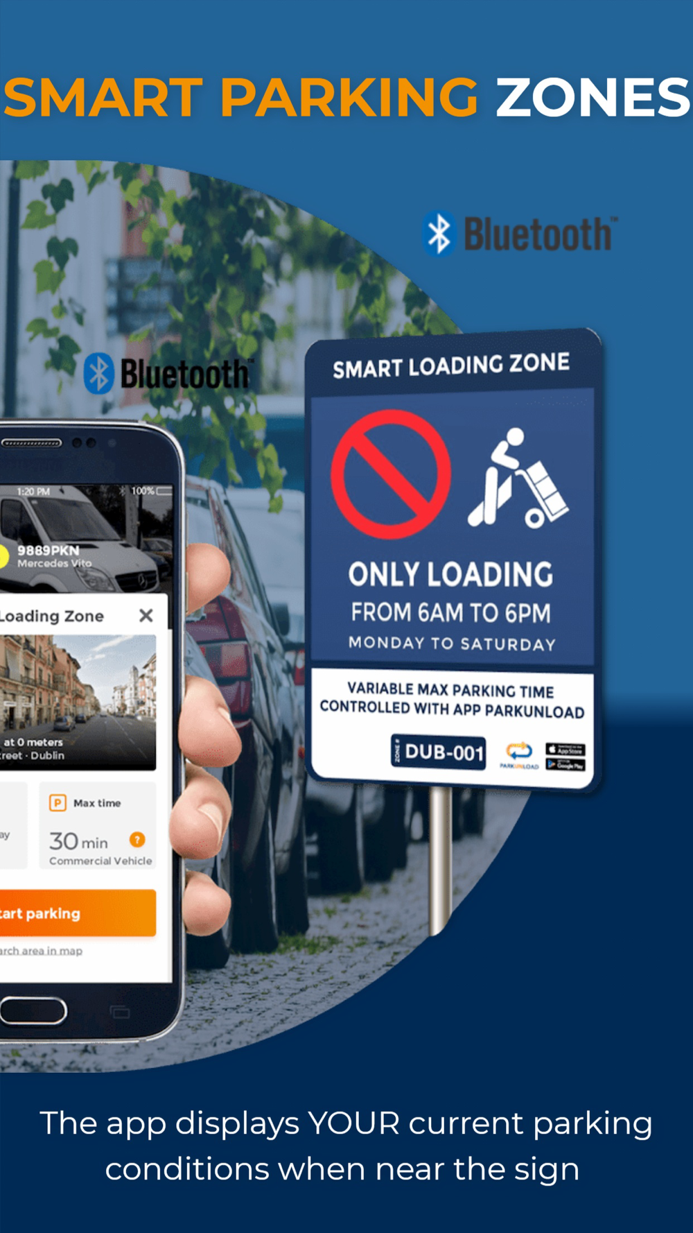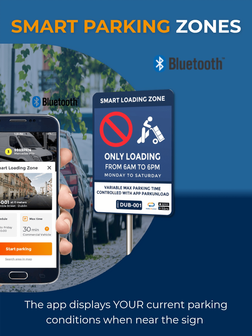 With Parkunload app you can get an instant proof-of-parking for your vehicle and user profile at your precise location based on Bluetooth sensors, as well as estimated parking availability nearby and other digital services.