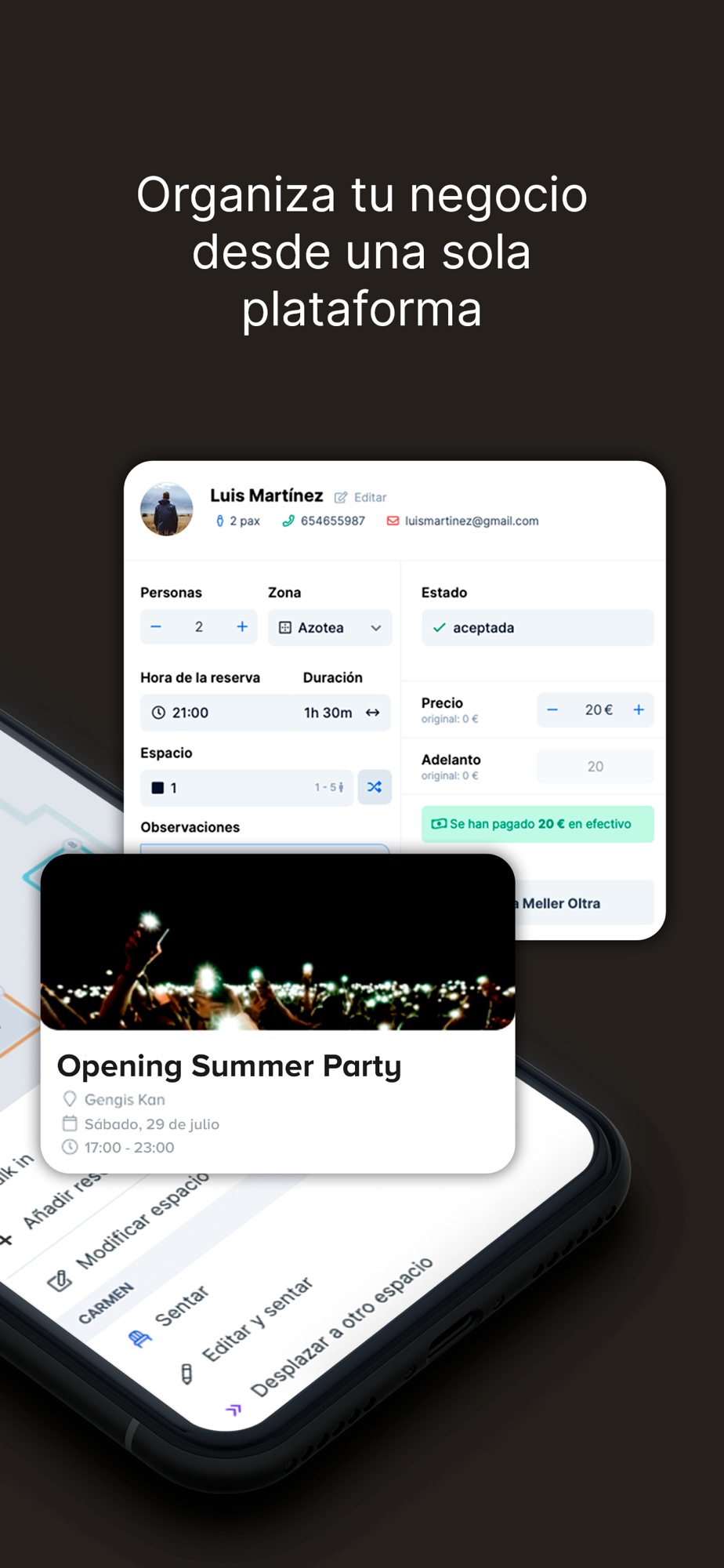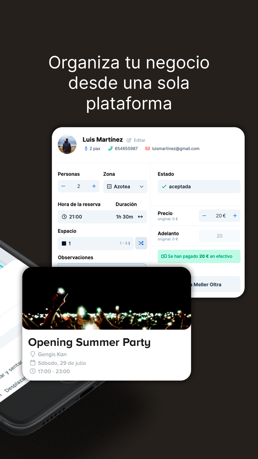 Visualiza y asigna las reservas en tus diferentes espacios. Durante el evento, observa los datos de cada reserva y acompaña a tus clientes a su mesa.