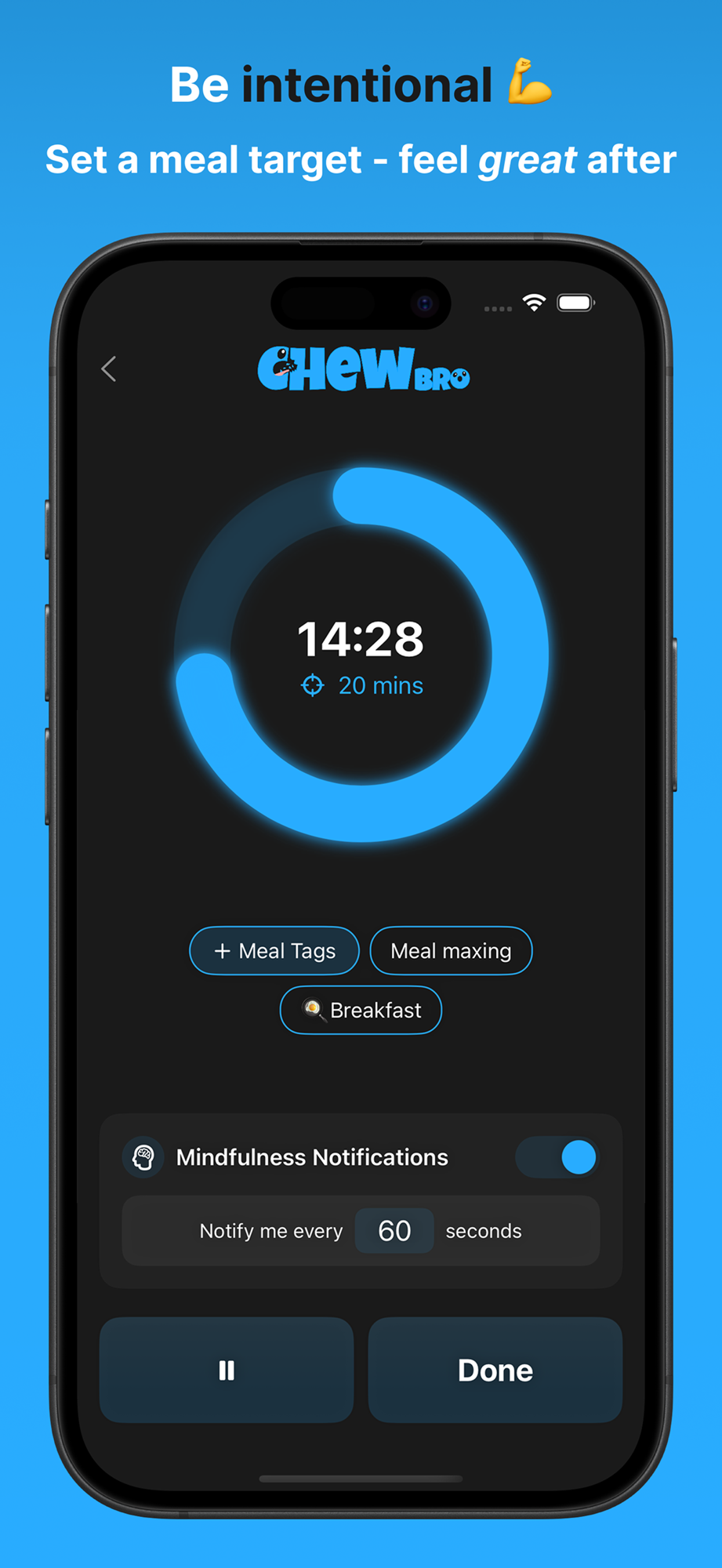 ChewBro is your go-to companion for mindful eating, helping you slow down and fully enjoy your meals. By encouraging intentional eating habits and guiding you through each bite, ChewBro refocuses your attention on savoring flavors, improving digestion, and fostering a healthier relationship with food.