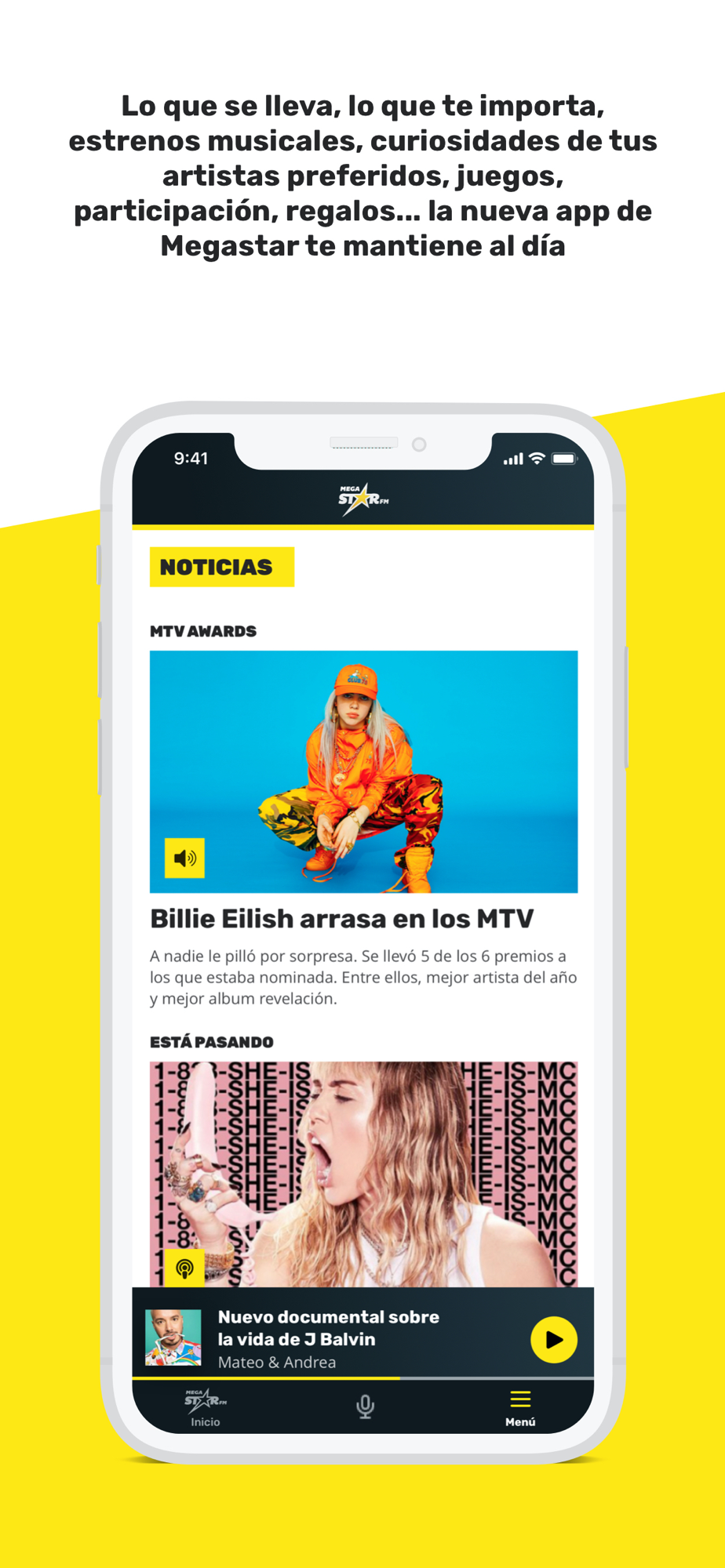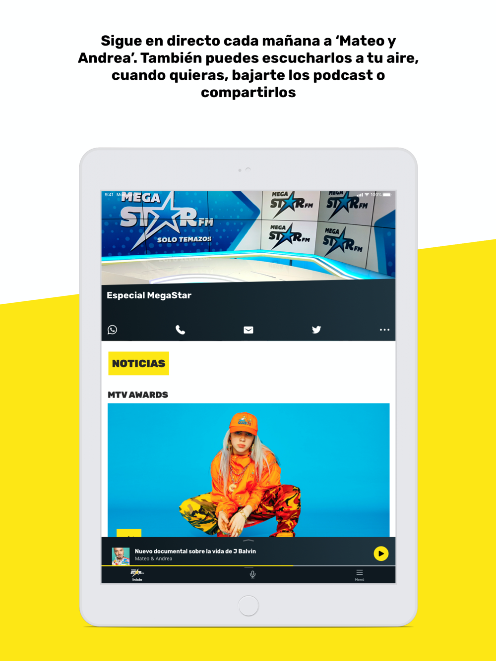 • Noticias: Entérate de todo que te interesa, las tendencias del momento, las novedades y entrevistas sobre tus artistas favoritos, tus canciones preferidas, los mejores vídeos. Todo para que estés al día de la música que suena en MegaStarFM.