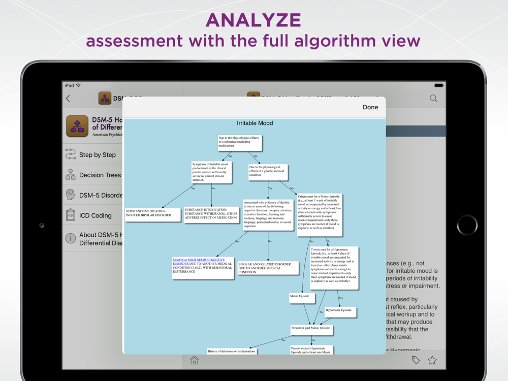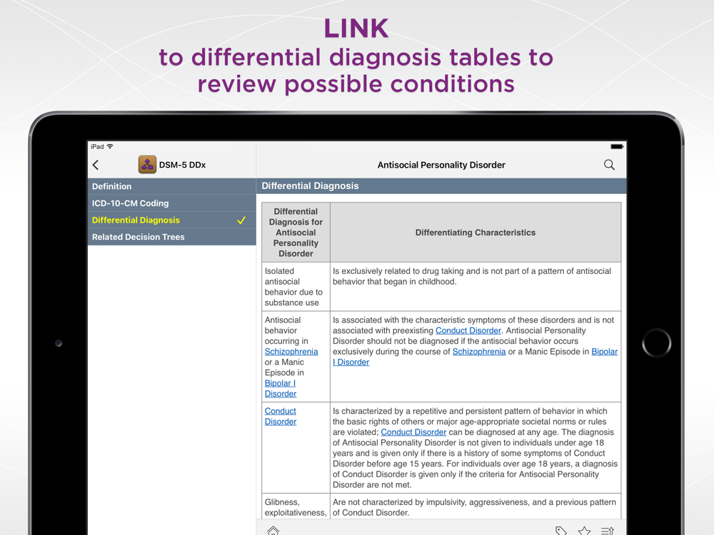 All clinicians are trained to make accurate diagnoses. Beginning with the patient’s presenting symptoms, they ultimately narrow down multiple options to one condition. The DSM-5 Differential Diagnosis Handbook can play a critical role in this process by improving the diagnostic process of psychiatric conditions. Leveraging latest DSM-5 classifications from the American Psychiatric Association, users are able to use a trusted 6-step process when dealing with, sometimes unfamiliar, psych conditions.