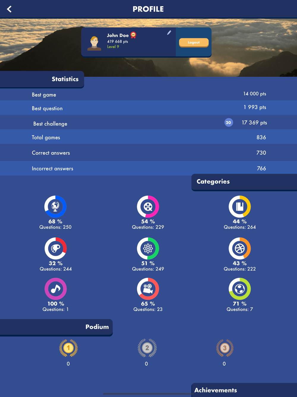 TRIVIAL shows a set of statistics for you to stay on track of your performance in the game and always try to improve your maximum!
