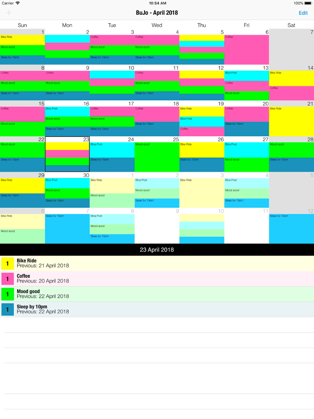 BuJo gives you a calendar on to which you can 'paint' days different colours, for any purpose you like. For example, you could record days you rode your bike, worked the night shift, went for a run, drank coffee, woke up before 6am, didn't drink alcohol, had a meeting, mowed the lawn, washed the car, spoke to your Aunt, ate less than 2000 calories, etc etc. Whatever you want!