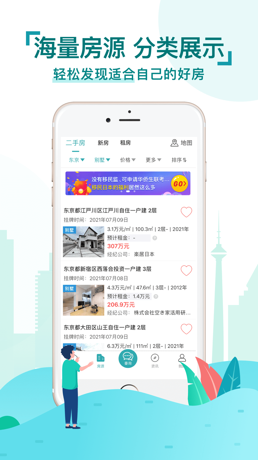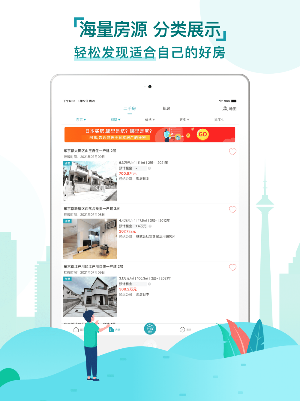 房源分类:根据房源属性将房源分公寓、别墅、整栋、土地、民宿、商铺,共计六种不同类型,方便对日本房产感兴趣的购房者快速查看合适的日本房产