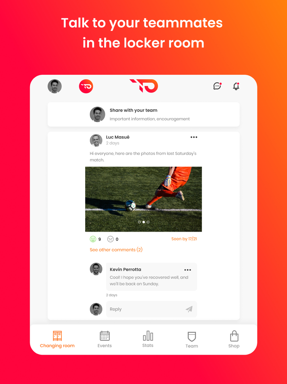 - SOCIAL: Enjoy a dedicated space for each team, the Locker Room, where each member can express themselves, react, and share photos, videos, or documents with the entire group. Create a friendly atmosphere and strengthen team spirit.