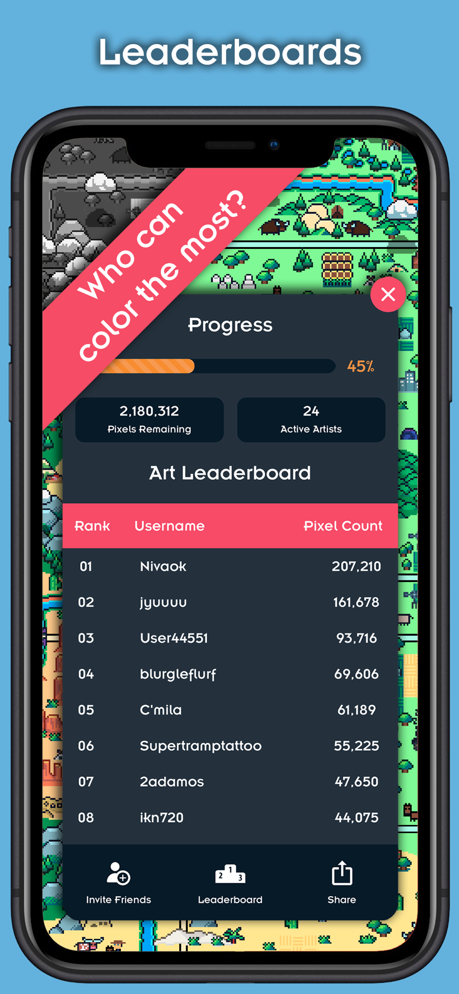 ● Leaderboard tracking pixels colored by all artists