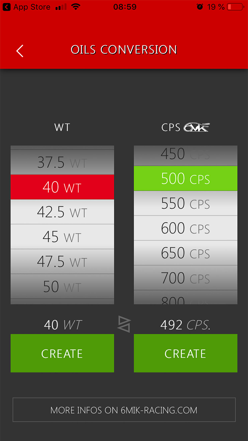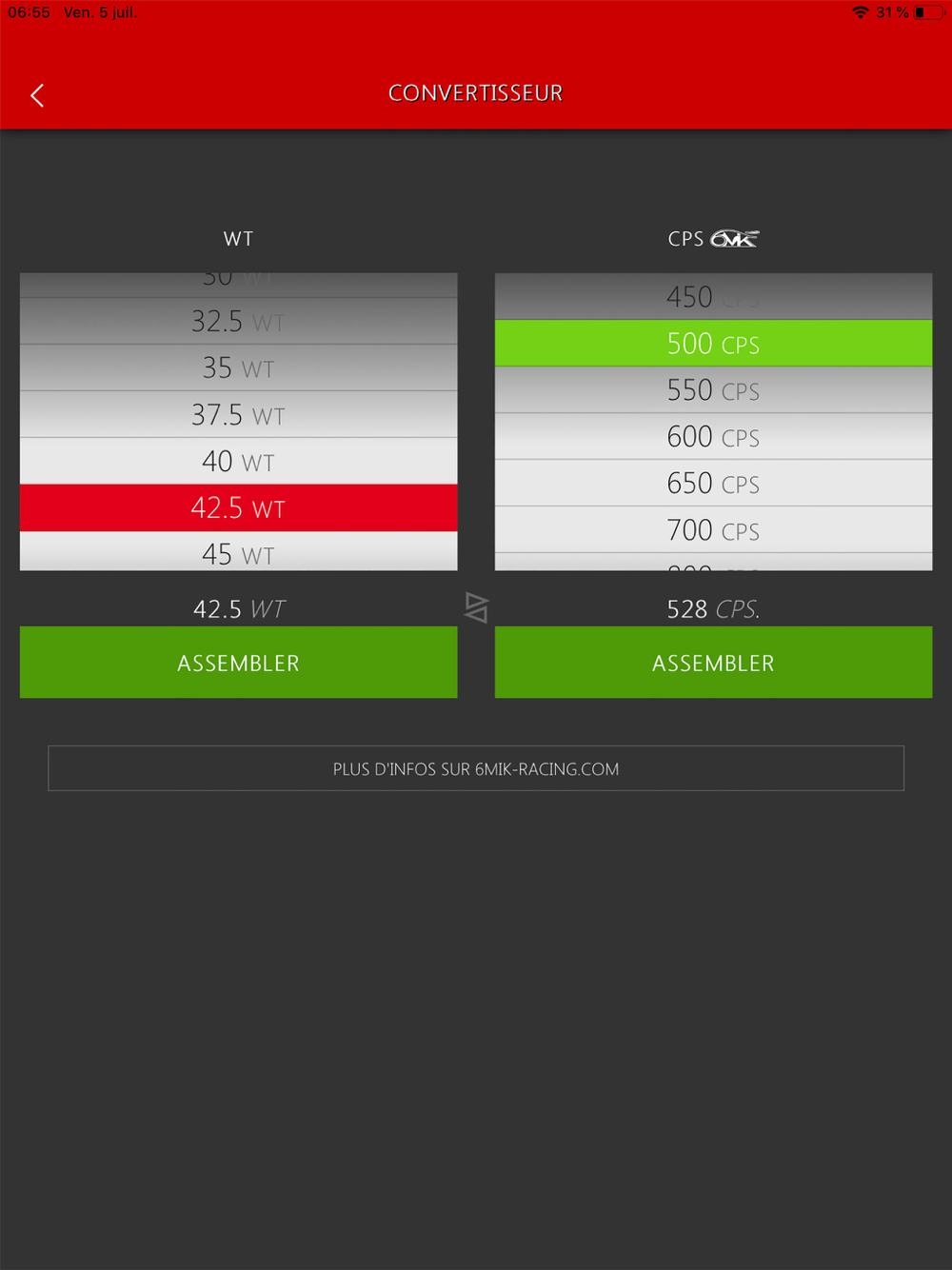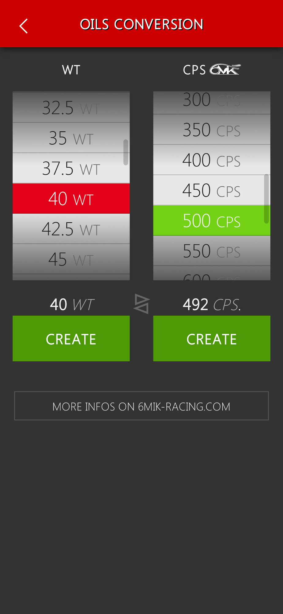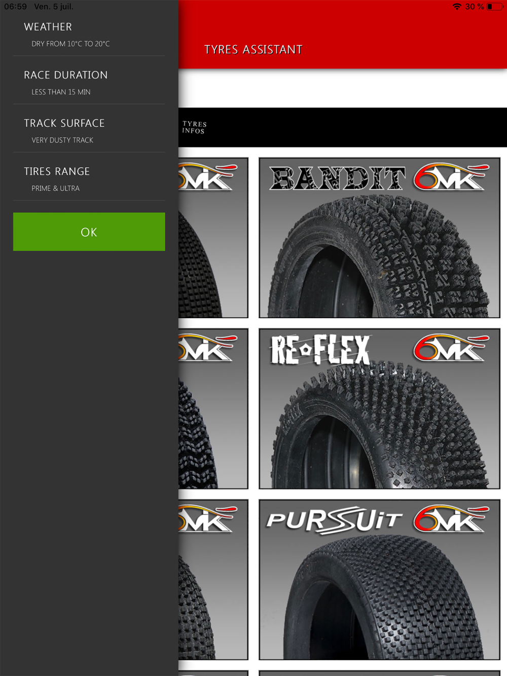 - TIRES CHOICE TOOL : get useful informations about all 6MIK tires range. Select the temperature, the race duration, and track surface, then, the application would select for you the most adapted tire/compound choice.
