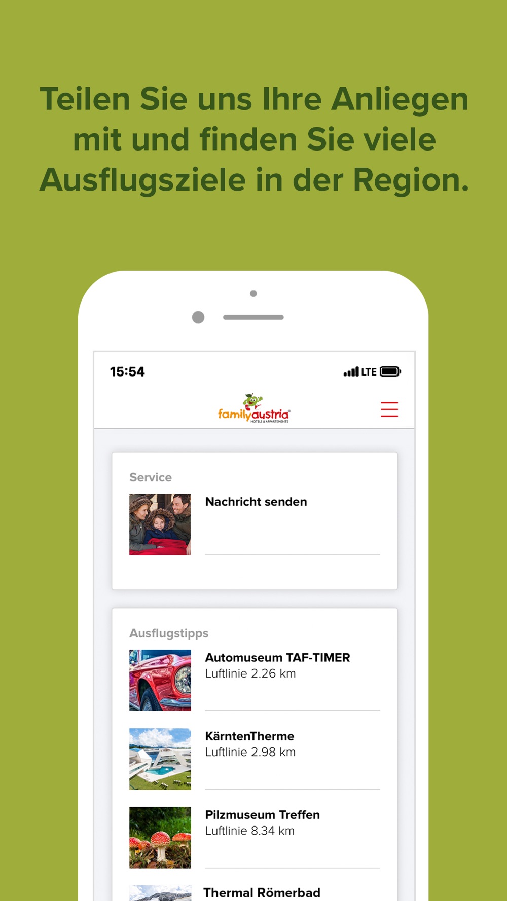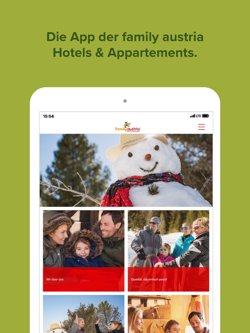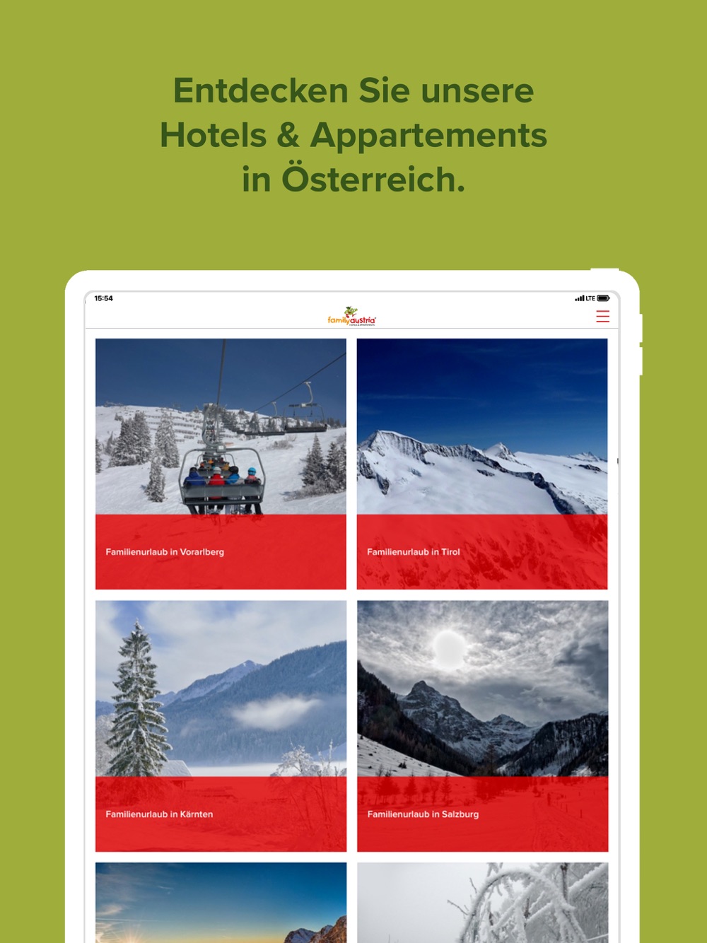 Entdecken Sie unsere Hotels sowie Apartments in Österreich und suchen Sie sich ganz bequem eine Unterkunft für Ihren nächsten Urlaub. Egal ob Familienurlaub in den Bergen oder der Stadt, Aktiv- oder Erholungsurlaub in Vorarlberg, Tirol, Kärnten, Salzburg, der Steiermark oder im Burgenland – gestalten Sie ganz einfach über die App Ihr persönliches Familien-Urlaubsglück und genießen Sie die Vorzüge von family austria.