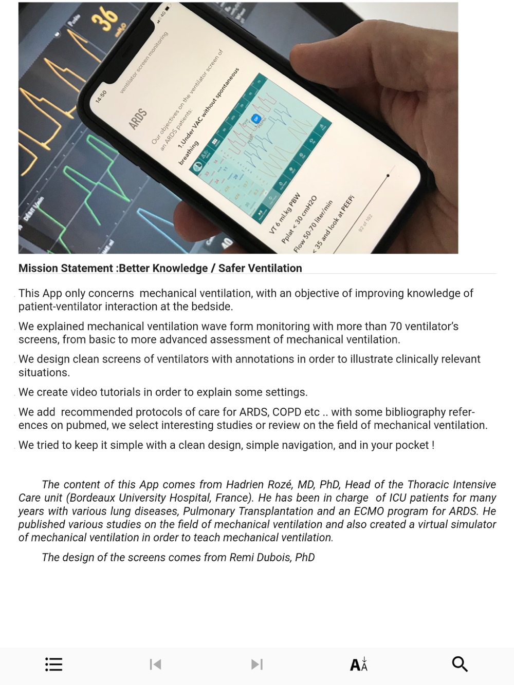 Pathological cases are explained using ventilator screenshots, from basic assessment to more advanced understanding (>60 screenshots). The screenshots are presented with annotations to illustrate each situation and to help you understand them; major studies. The aim is to keep it simple with a sleek design in your pocket at the bedside!