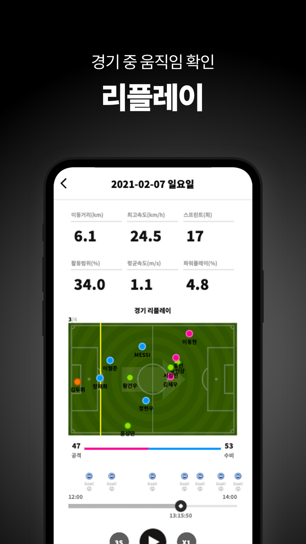 - 뛴 거리, 최고속도, 평균속도, 스프린트, 활동범위, 파워플레이 등의 스탯을 확인할 수 있습니다.