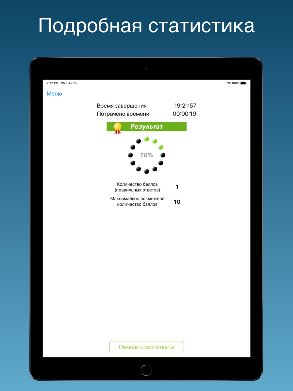 • Работа над ошибками - в режимах "Экзамен", "Марафон" и "Тренировка в избранном" Вы можете сделать работу над ошибками.