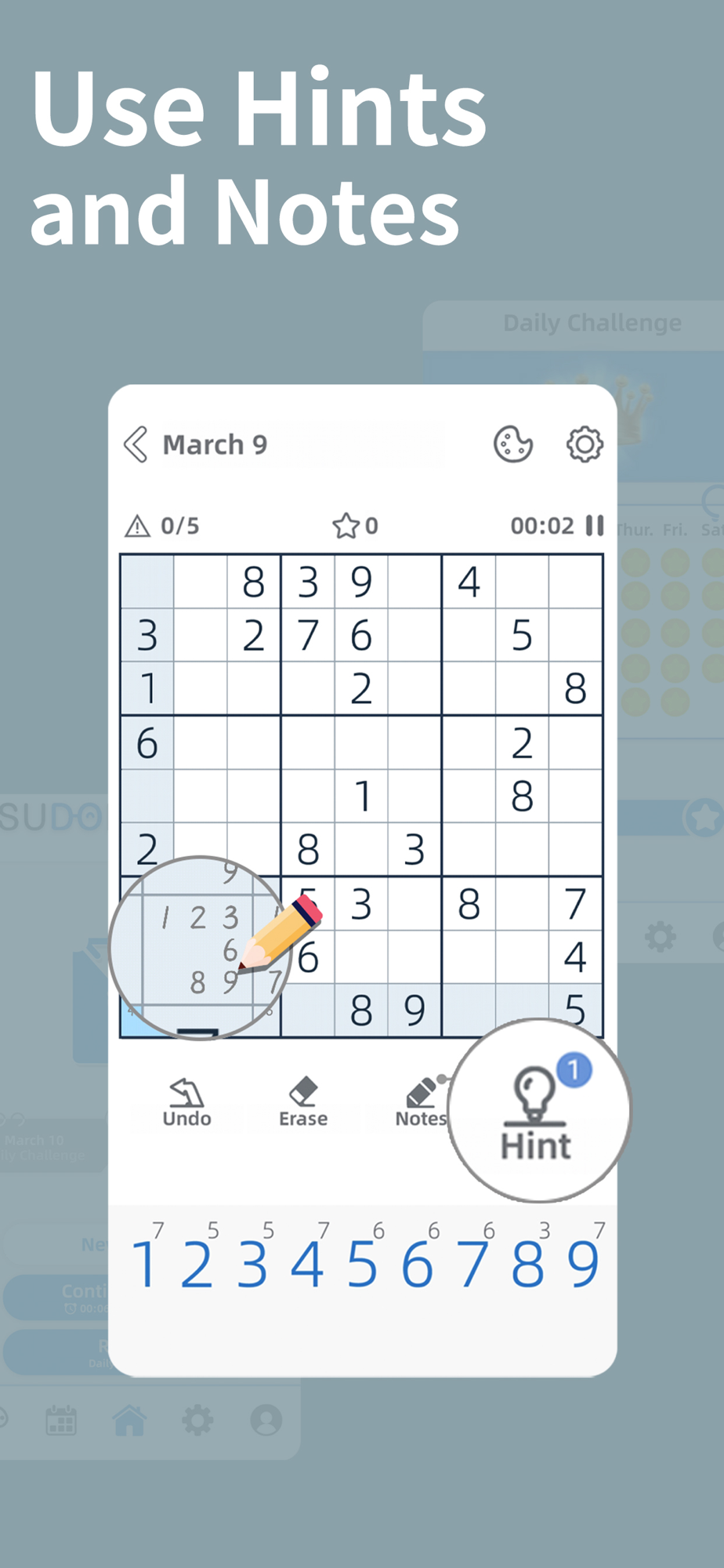 - Daily Challenge & My Challenge: you can challenge every day to practice your skills of playing sudoku