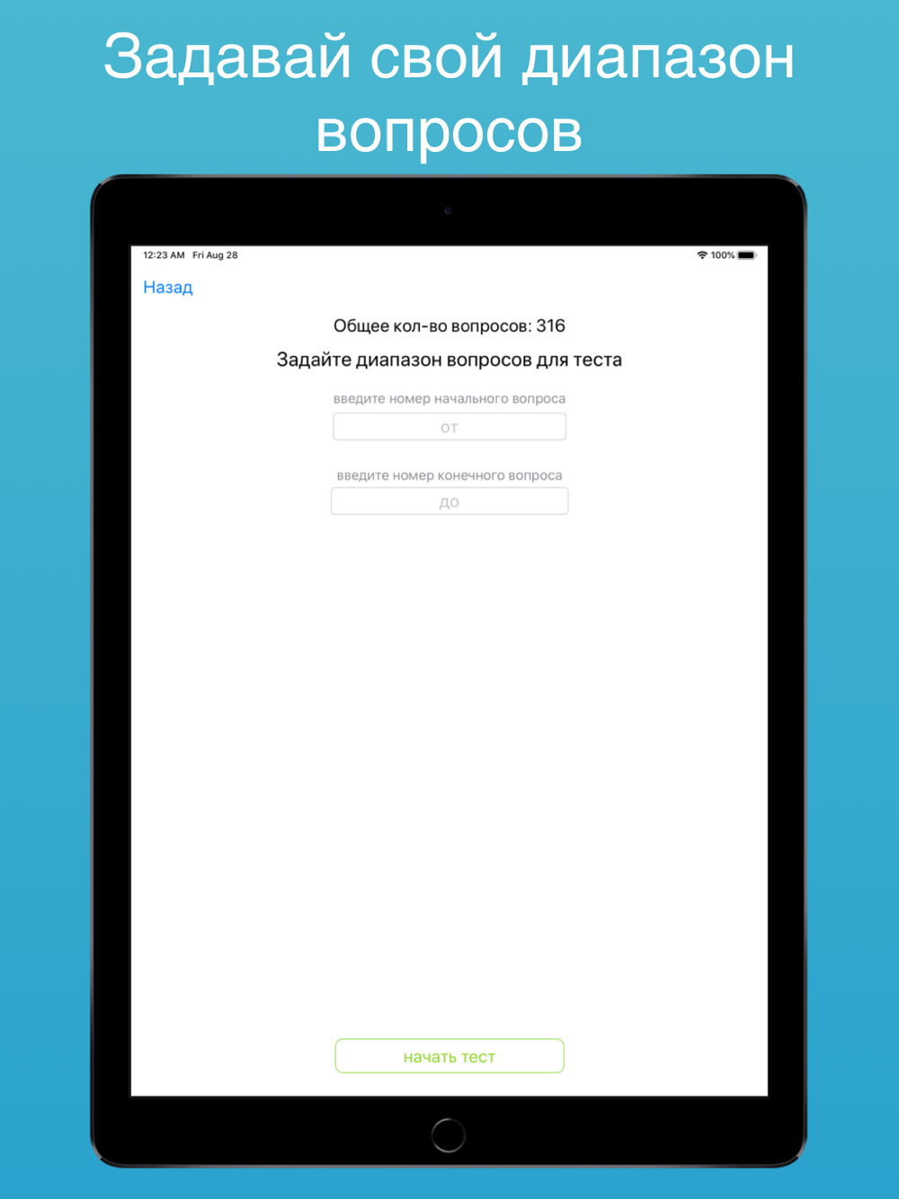 • Марафон - Предлагается ответить на все вопросы с возможностью выбора вопросов или же все вопросы, без ограничения по времени и ошибкам;