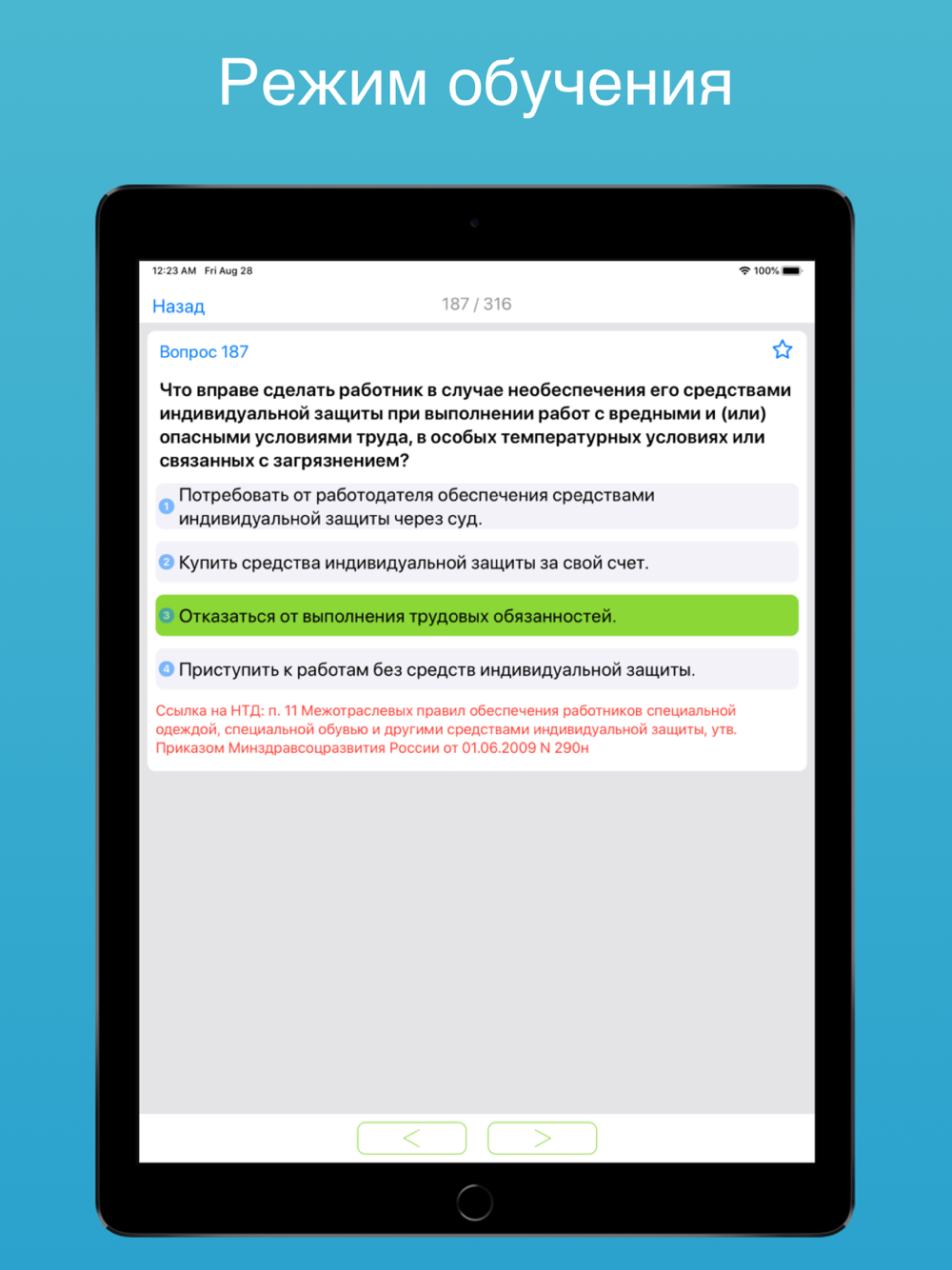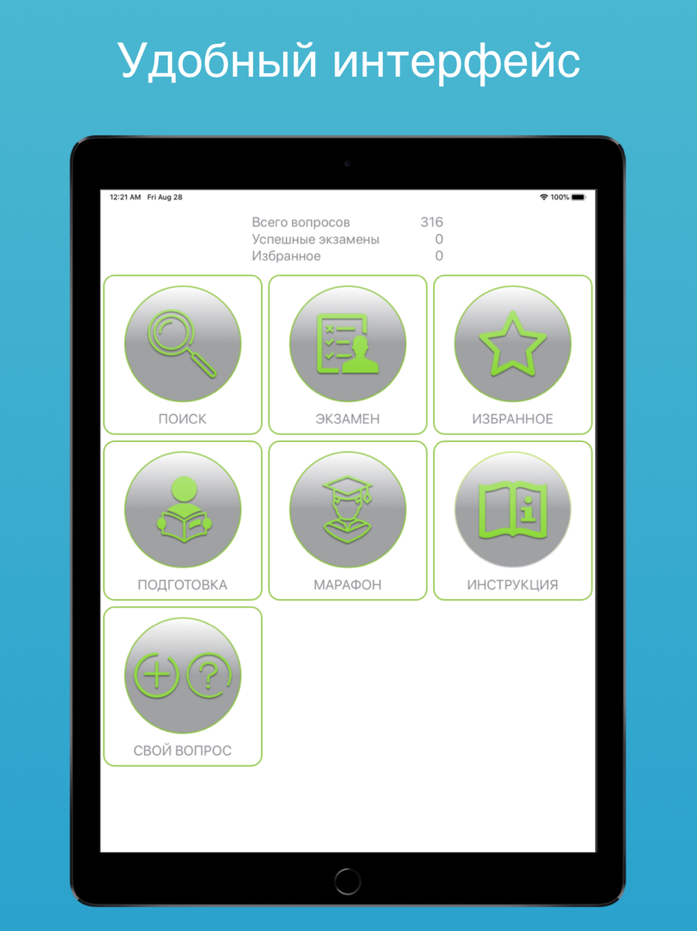 • Подготовка - Позволяет изучить вопросы в текстовом формате с отмеченными правильными ответами;