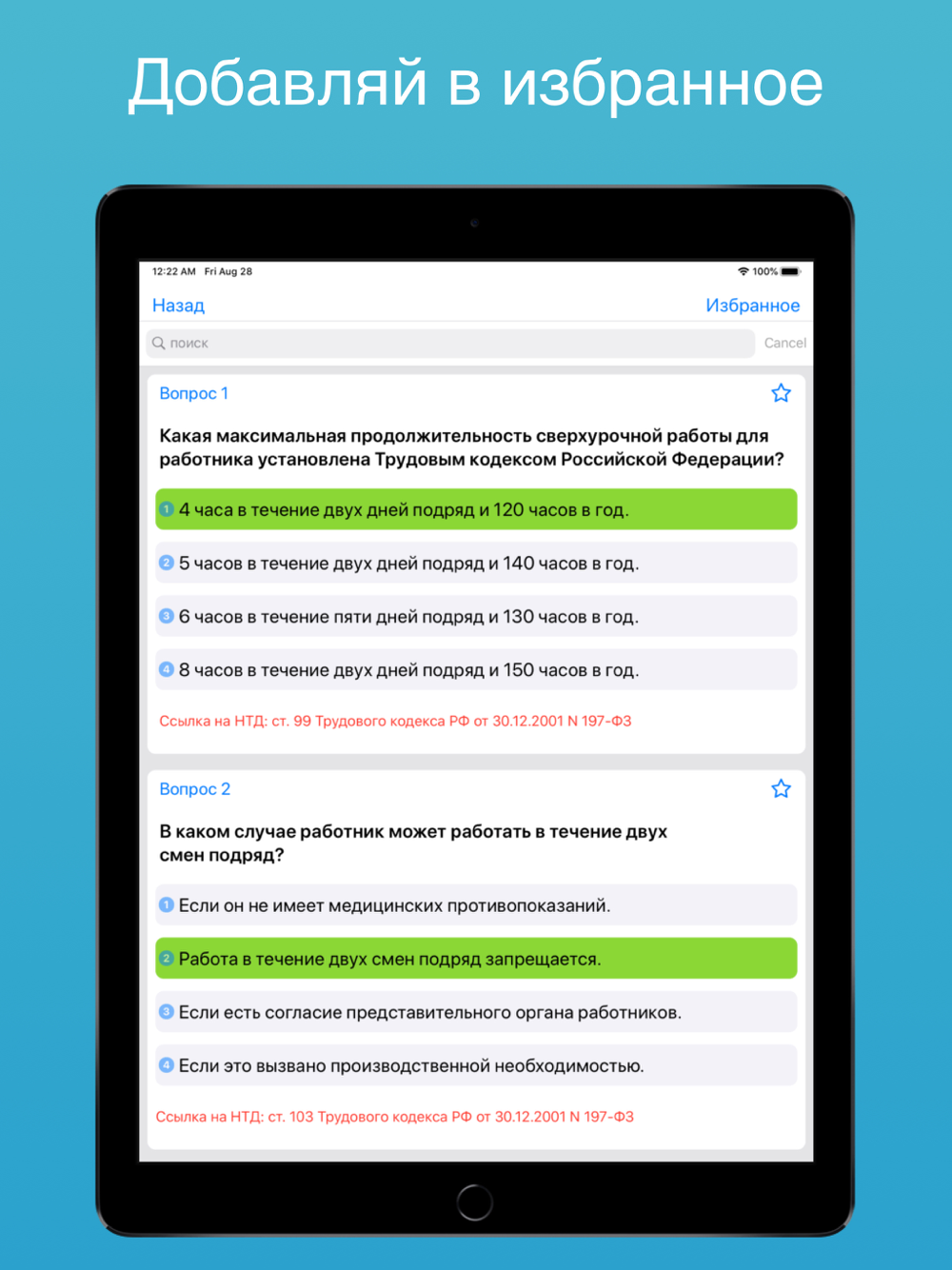 • Работа над ошибками - в режимах "Экзамен", "Марафон" и "Тренировка в избранном" Вы можете сделать работу над ошибками.