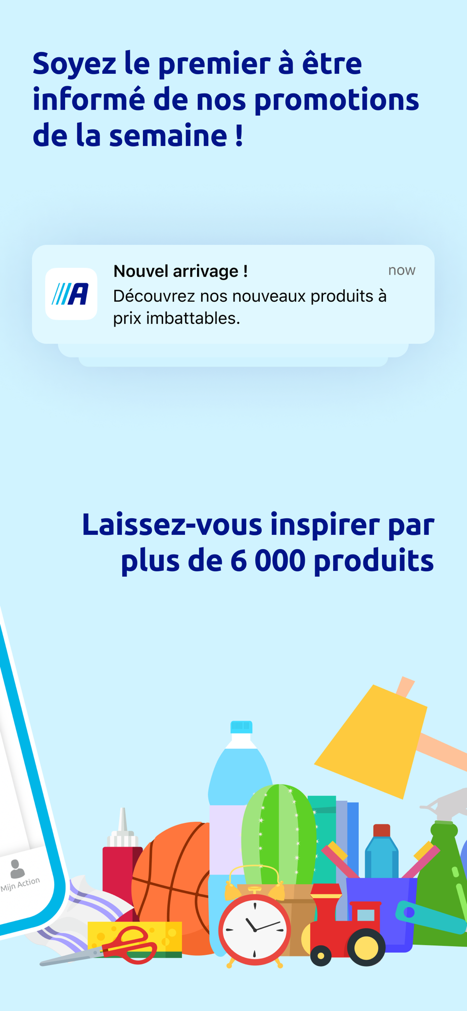 L'application Action vous permet d'accéder 24h/24, 7j/7 à tout ce que vous trouverez habituellement dans votre magasin Action préféré. Vous serez le premier informé de nos promotions de la semaine et de nos derniers arrivages. Vous avez vu un produit qui vous plaît - ou dont vous avez besoin ? Ajoutez-le à votre liste de favoris ! Vous ne manquerez plus jamais d'offres alléchantes ! Pratique, non ? Téléchargez l'application et laissez-vous inspirer par toutes ses fonctionnalités aussi utiles que sympas !