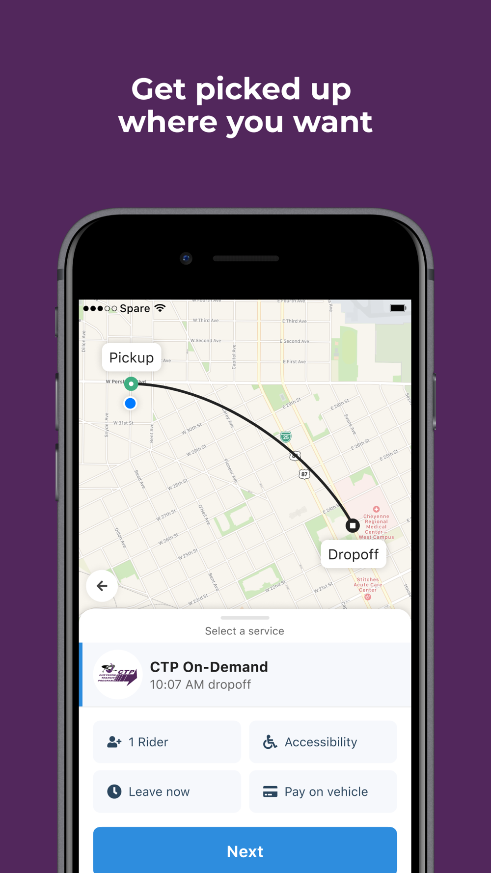 The Cheyenne Transit rider app brings convenience to your fingertips. It allows you to schedule your trips, be notified of the bus arrival time and see the location of your bus on your device.