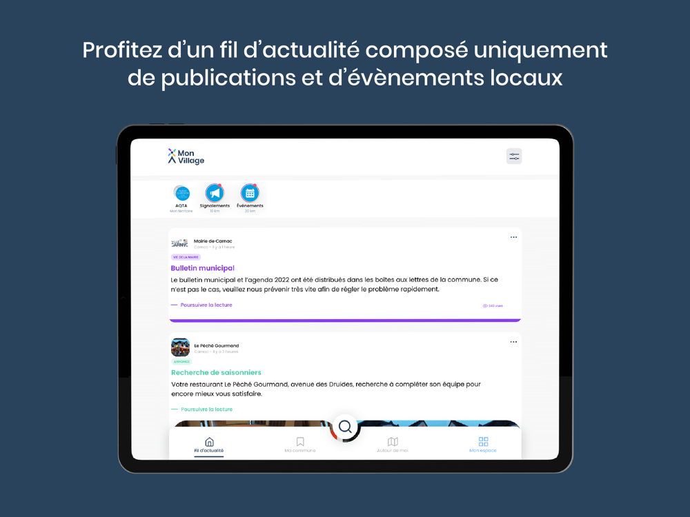 Conçue comme un service d'utilité publique, l'application Mon Village permet la circulation d'une information claire, rapide et efficace entre une municipalité, ses administrés et ses visiteurs.