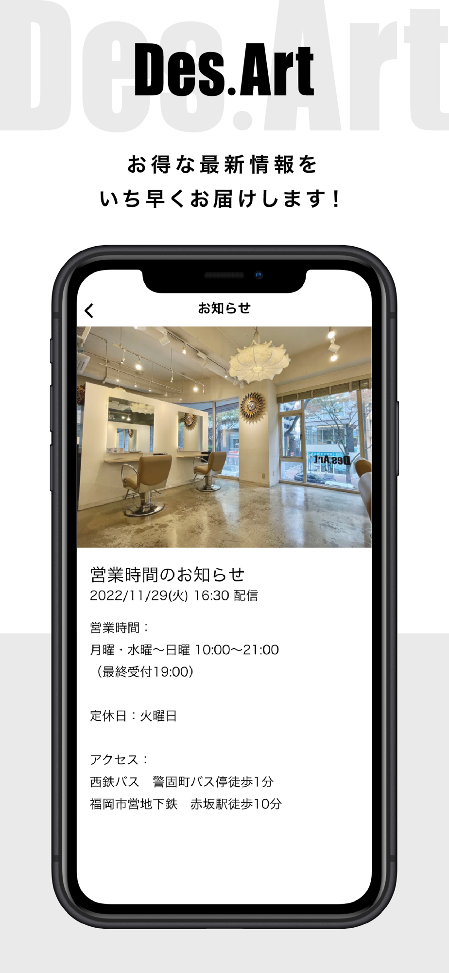 「Des.Art」の公式アプリでは、スタンプカード、店舗イベントなどの情報、サロンメニューをお届けしています。