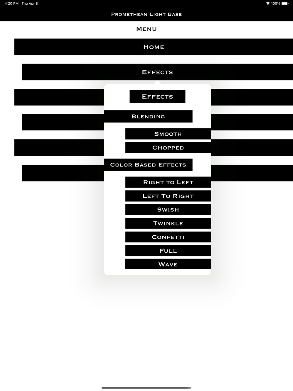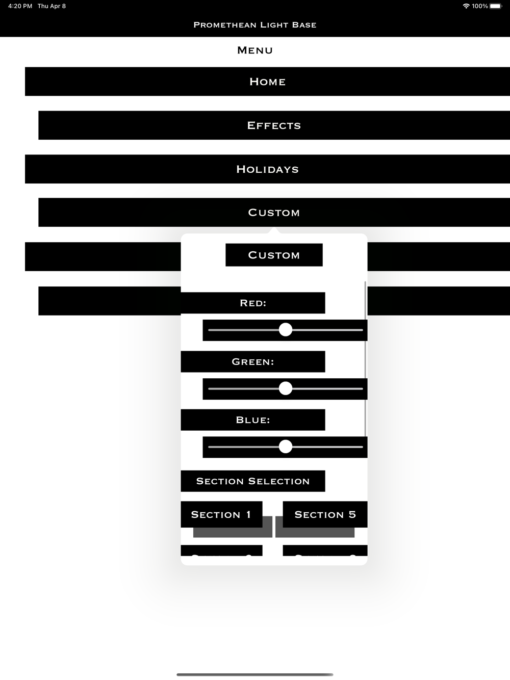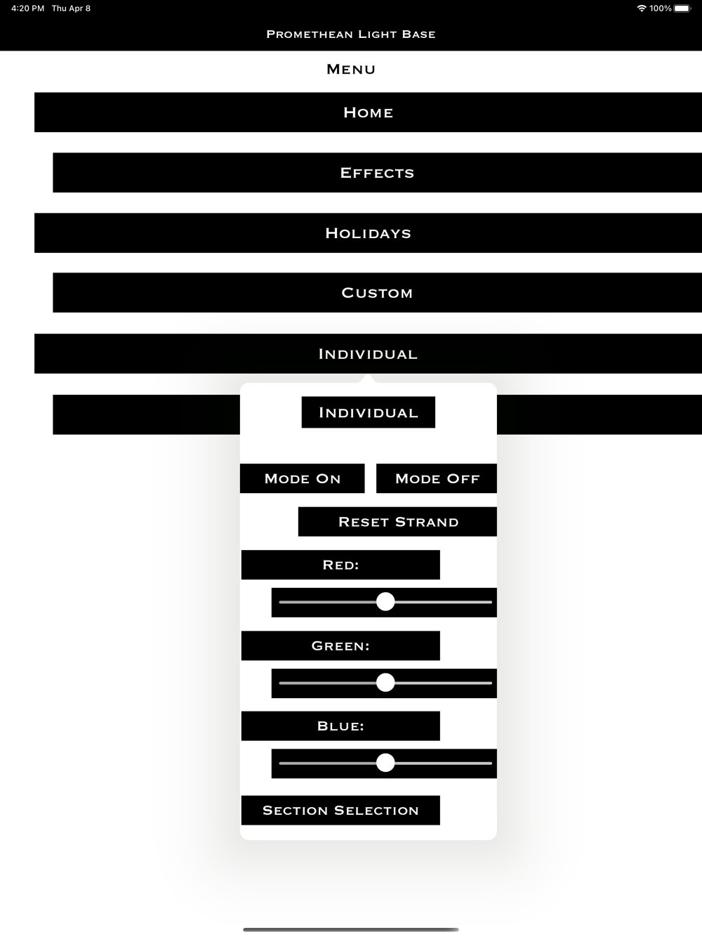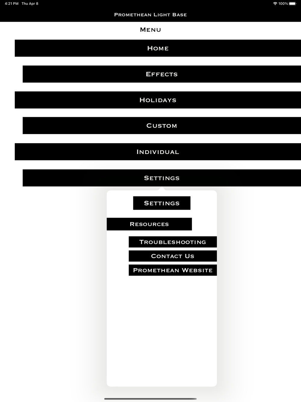 This app is used to control your Promethean Light Base. This unlocks the full potential of your mini light show system with access to over 4.5 trillion combinations, including various effects, holidays, custom colors, and individual LED controls!