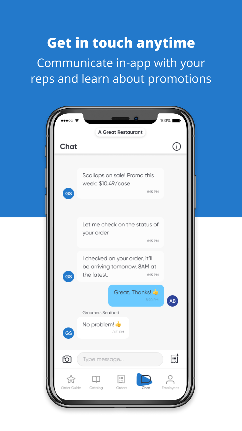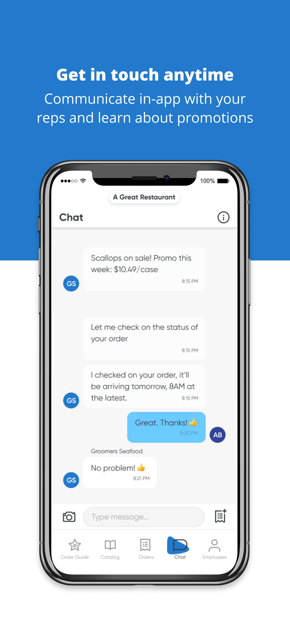 - Get in touch anytime: communicate directly with your Groomer's Seafood rep in the app