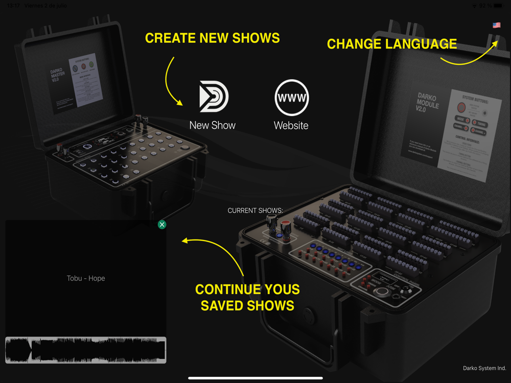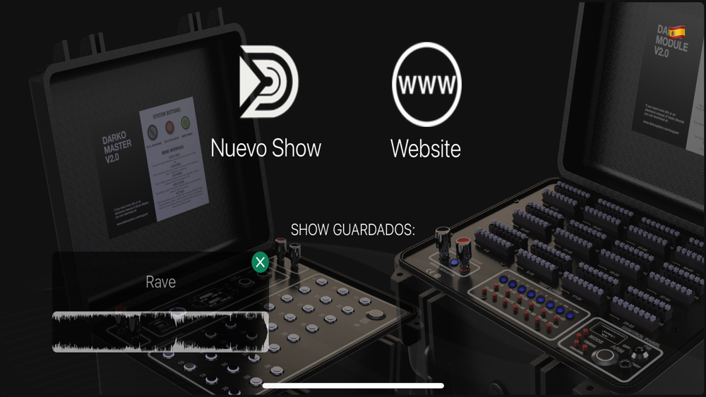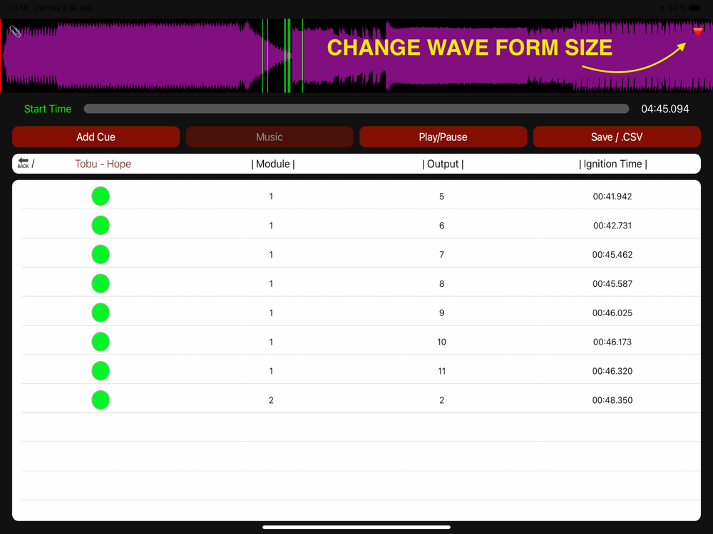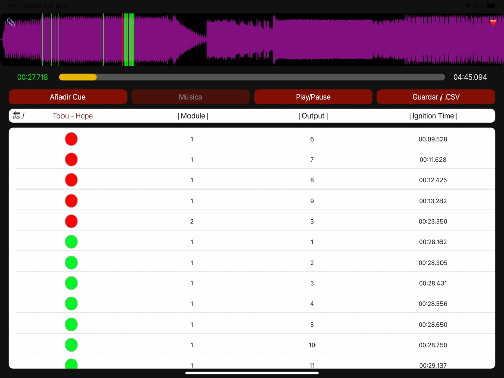 Selecciona tu propia música almacenada, marca lineas de encendido mientras suena de forma secuencial, o elige tú el momento de tiempo, módulo y número de salida manualmente. Siempre puedes editar de nuevo cada linea creada o eliminar las que no necesites. ¡No olvides guardar tu show volviendo al menu principal!