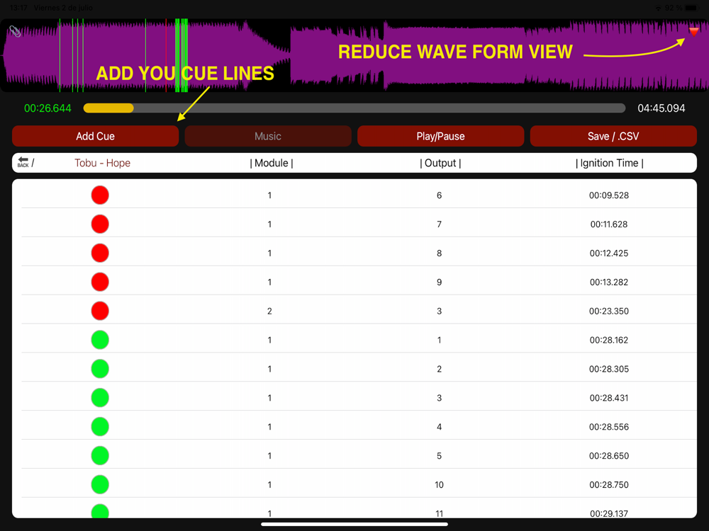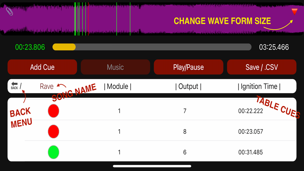 Select your own music, mark firing lines while it plays sequentially, or choose the time, module and the output number manually. You can always edit each cue mark again or delete the ones you don't need. Don't forget to save your show going back to the main menu!