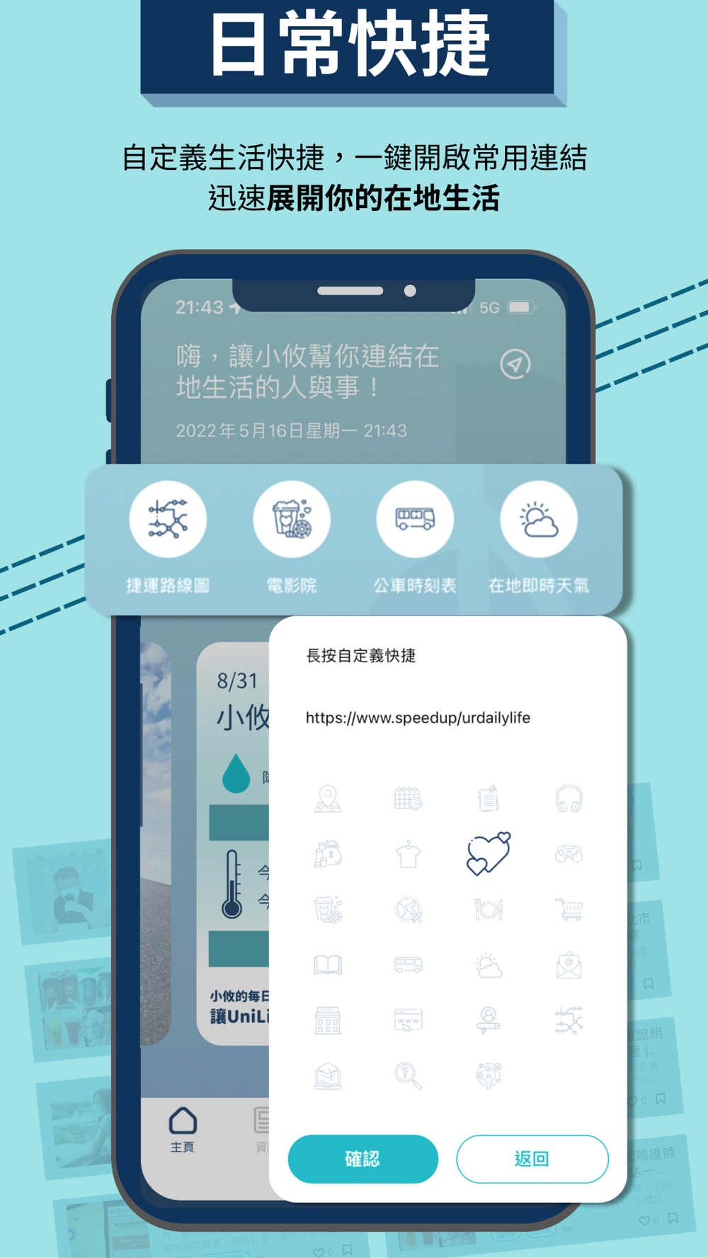自定義生活快捷,自行輸入常用連結並選擇合適的圖示,一鍵直達在地生活的常用網站,開啟每天的便利新生活。