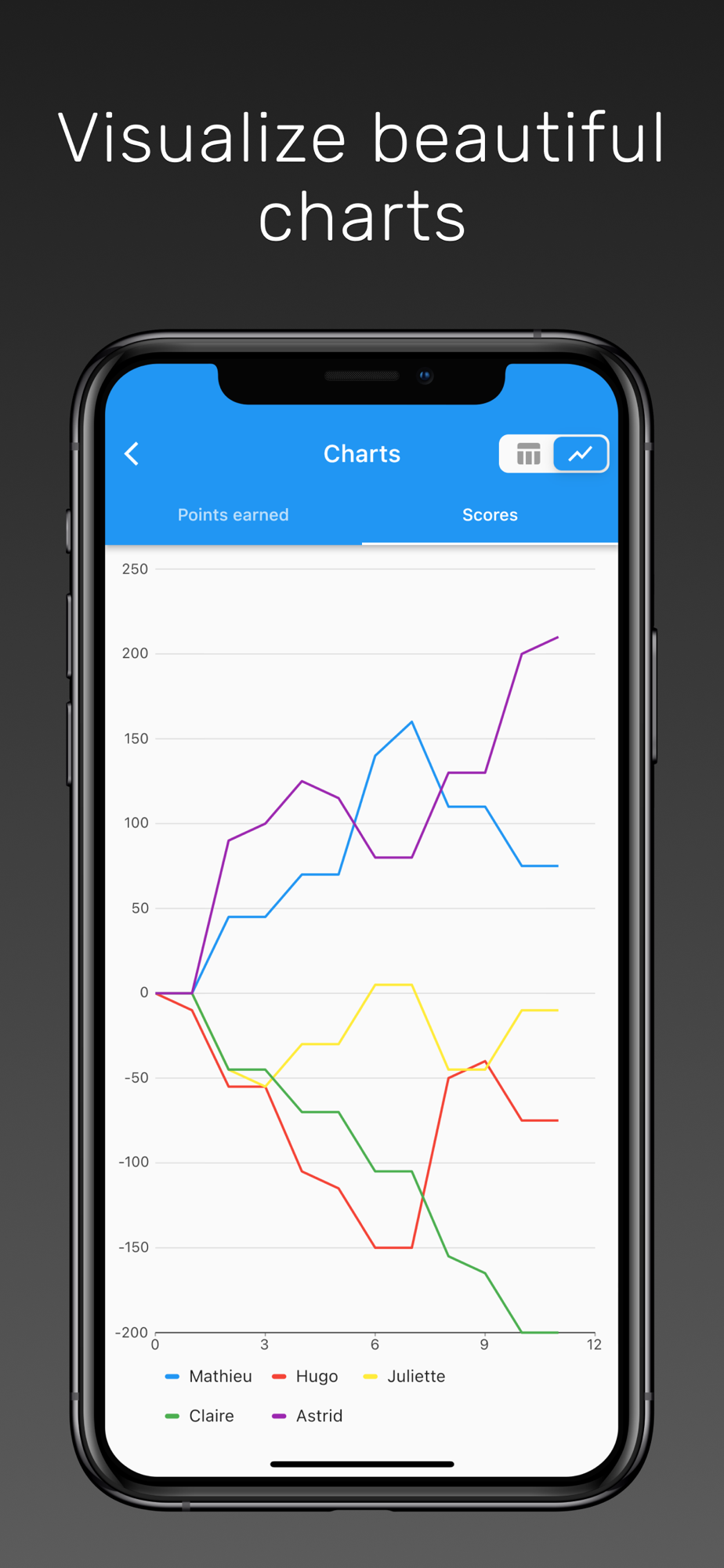 Colorful charts and score sheets let you visualize game progress over time in various ways.