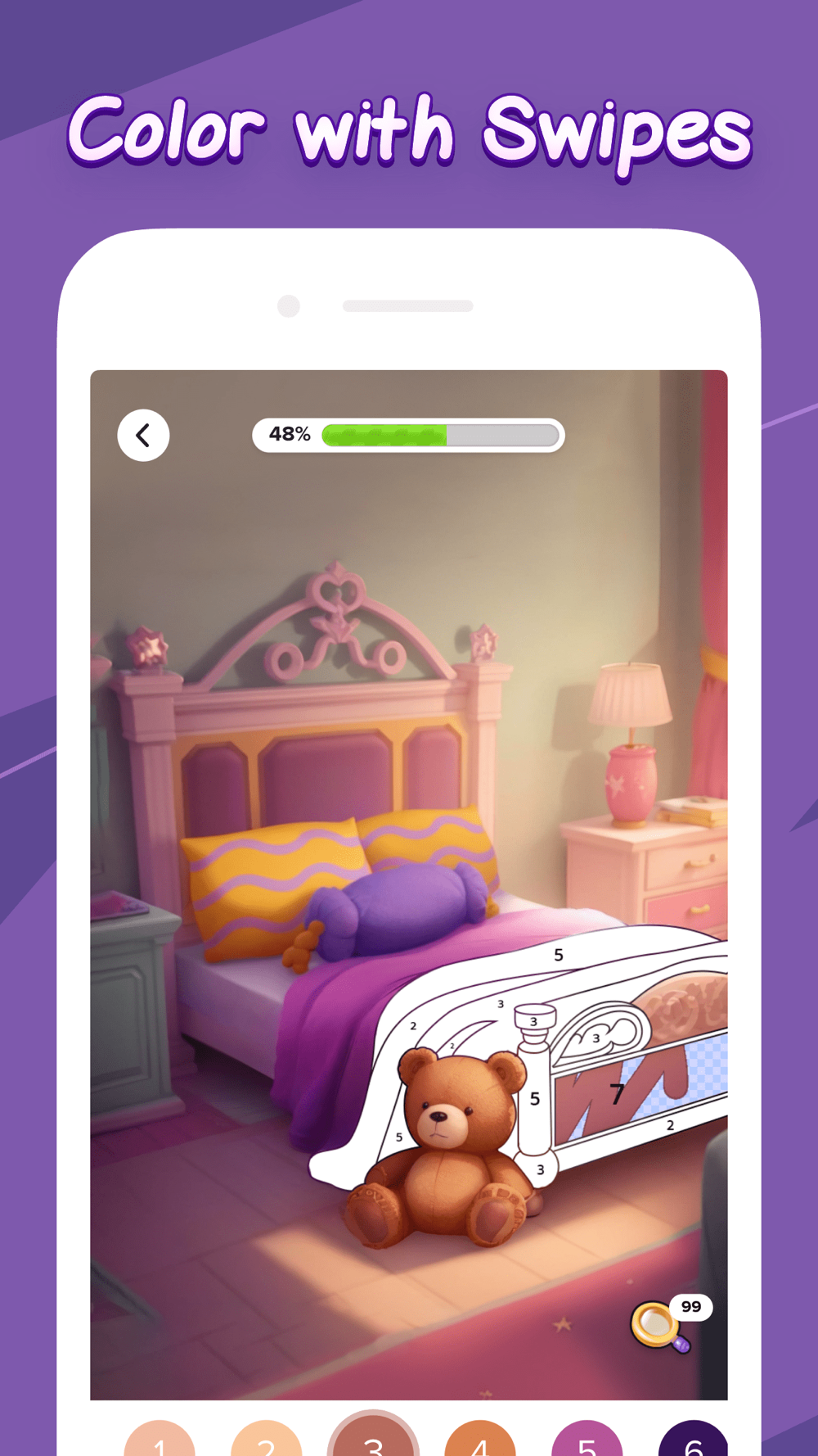 Our team has made deep research on the field of coloring apps and we developed our brand new coloring game! This time, tap and paint by number turn to the swipe and paint by number. This is a revolution in the world of coloring games.