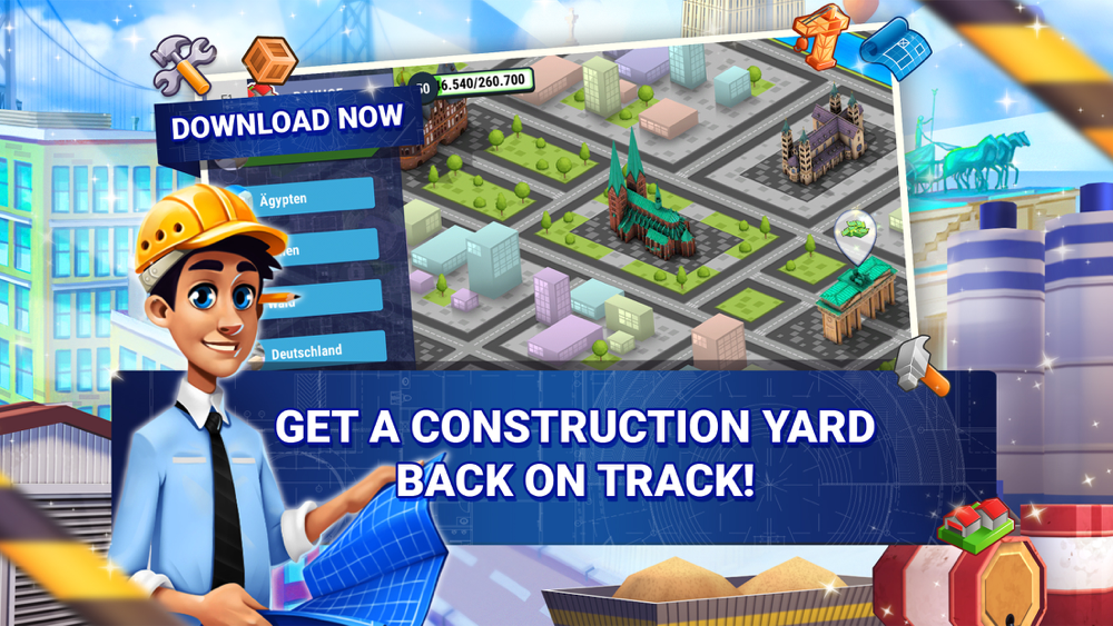 Let the dream of Las Vegas rise once more! You’ve inherited a construction yard, and have been tasked with completing your predecessor’s life’s work: A park with the biggest and most beautiful monuments the world has to offer. But structures like the Eiffel Tower, Brandenburg Gate and Colosseum don’t build themselves – their construction will require not only lots of workers, but also vehicles, materials, and money.