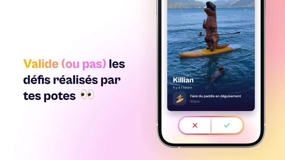 Tous les membres du groupe ont les mêmes défis à réaliser Chaque défi rapporte un certain nombre de points suivant son niveau de difficulté (1pt, 5pts, 10pts, 20pts, 50pts ... et 100pts pour les plus tarés d'entre vous !) À chaque fois que tu réalises un défi, prends-toi en photo ou en vidéo depuis l'application pour le valider !