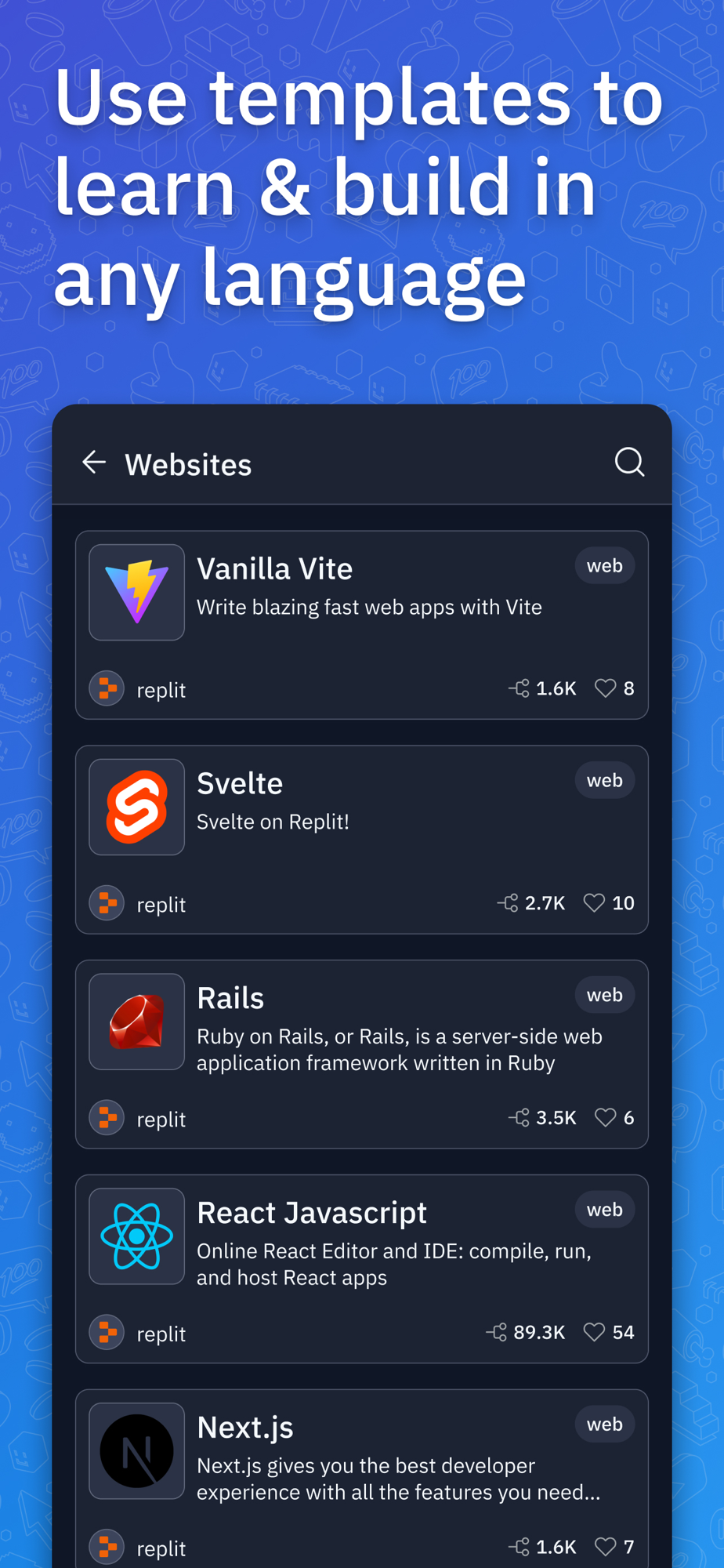Replit is perfect for you whether you're new to coding or have been shipping projects for years. If you're a beginner, we have easy-to-use templates so you can learn to code your first dream project. If you're an expert, Replit has advanced features so you can ship real, meaningful projects all from your phone.