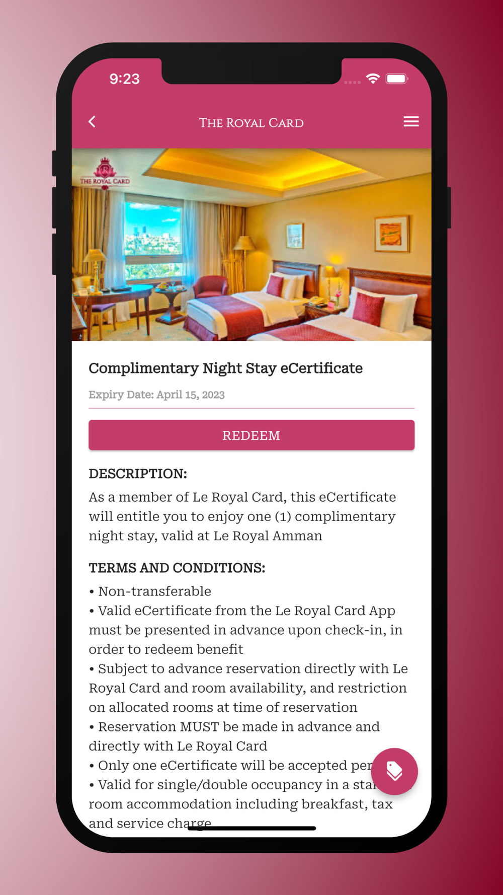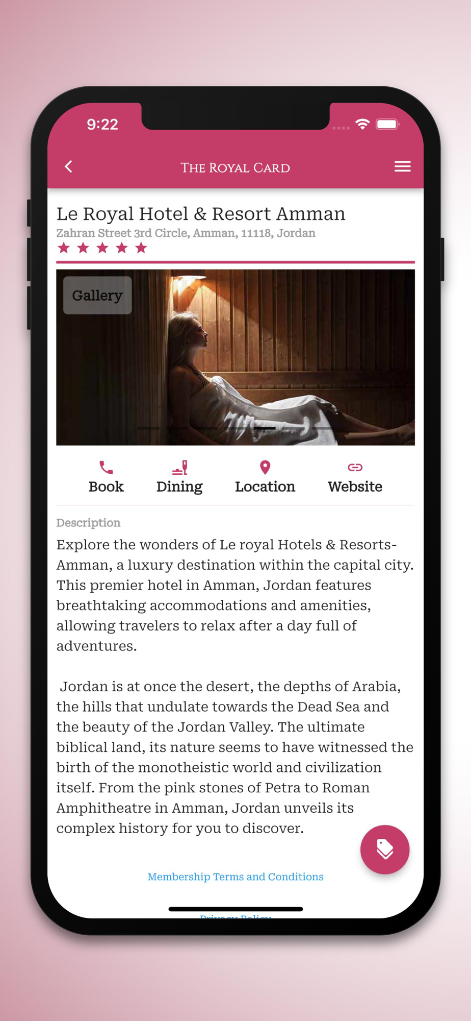 As a member of The Royal Card, this application provides you detailed information about Le Royal Amman, and the exclusive discounts and benefits you can enjoy during your visits to Le Royal Amman.