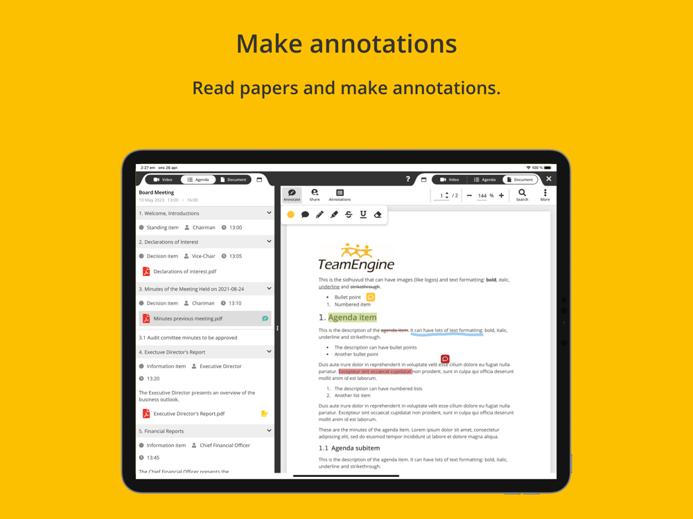 Get a clear overview of all future meetings and access agendas, papers and practical details all in one place. Read papers and make annotations that can easily be shared with other members. Download files and board packs to access them offline. You can e-sign papers with a secure digital signature, regardless of where you are. Use forums in your portal to share your opinions, participate in polls and communicate with your colleagues.