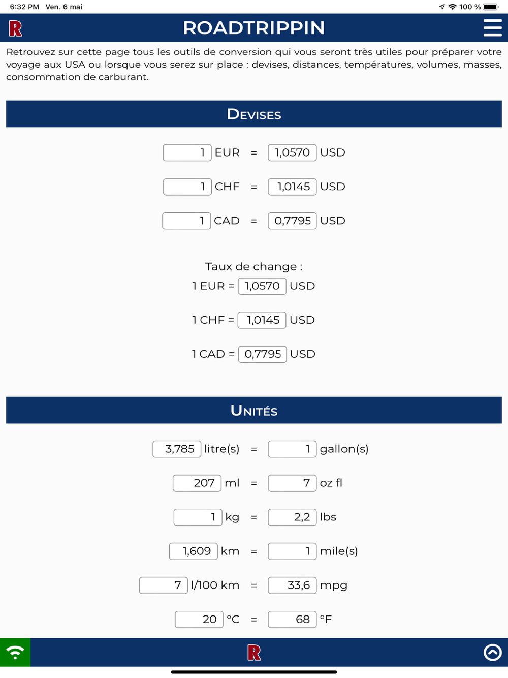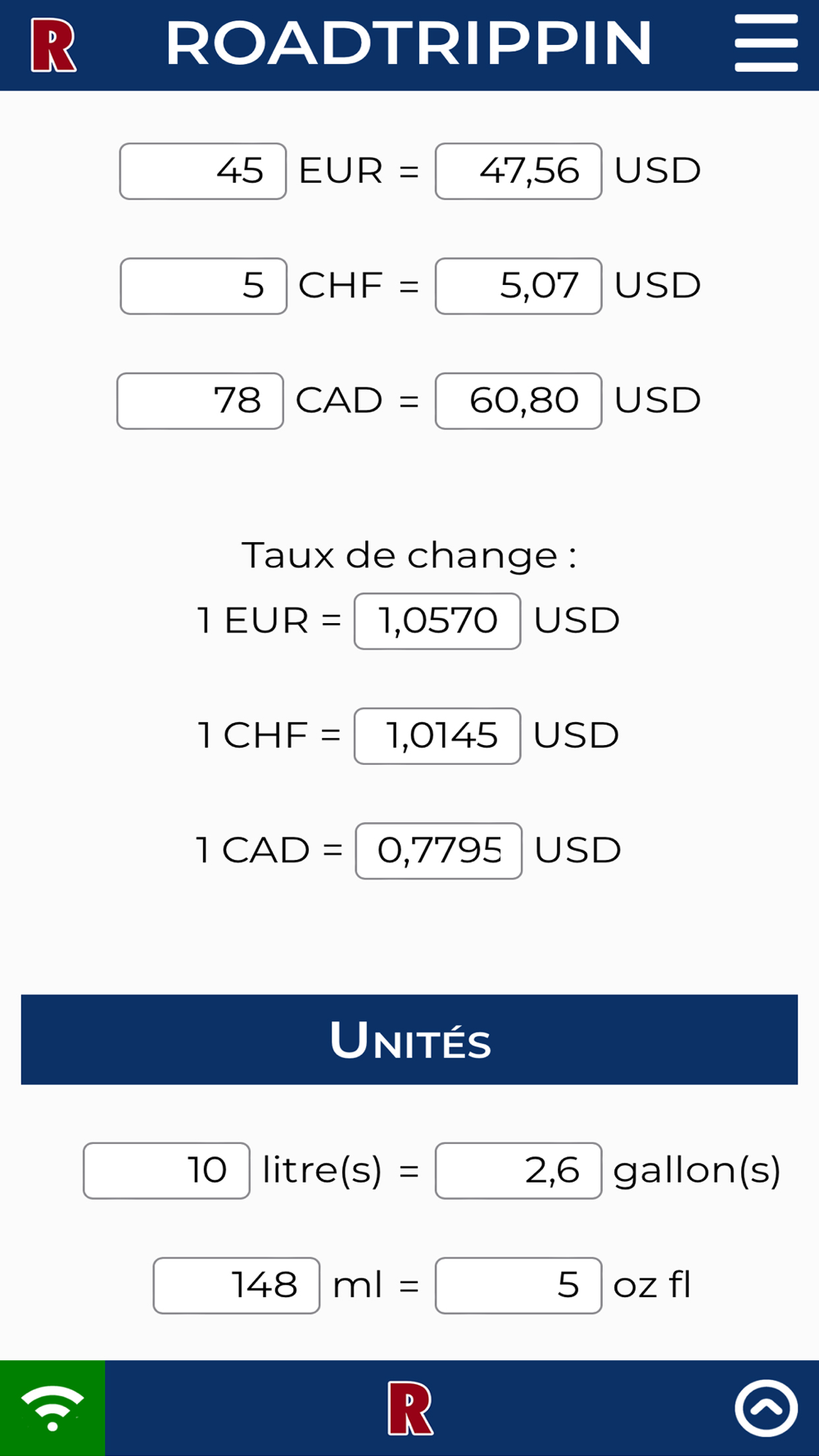 Un convertisseur de devises (EUR/CAD / USD) et un convertisseur d'unités (distance, volumes, poids, température, consommation de carburant...).